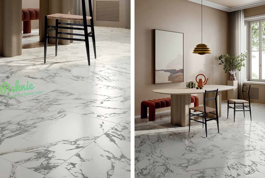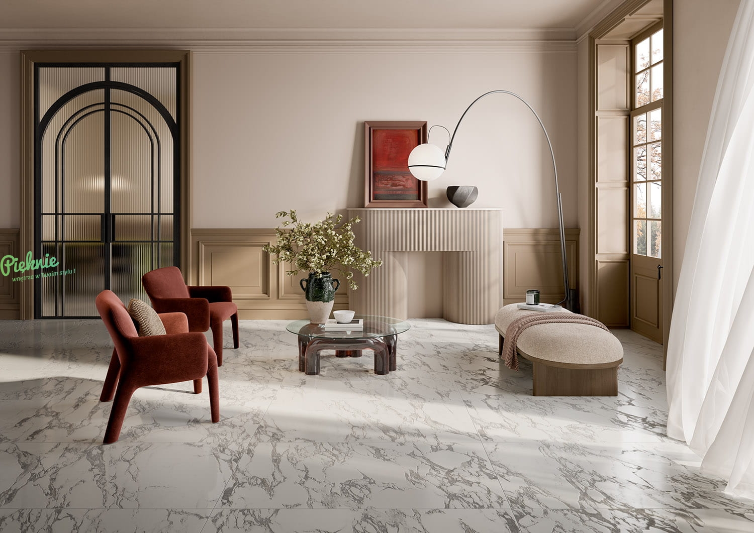Płytki uniwersalne Alfalux Marvilla imitujące marmur. Kolekcja dostępna jest w sześciu wzorach oraz w trzech wykończeniach: klasycznym matowym (Matt), w gładkim połysku (Lucido) oraz wersji Touch, czyli satynowym macie z wybiórczo podkreślonymi, wklęsłymi wzorami żył marmuru. Płytki idealnie sprawdzą się w całym domu: począwszy od kuchni i łazienki, przez korytarz, salon po sypialnię.