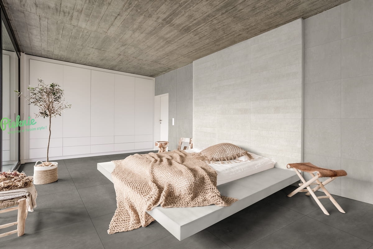 Płytki gresowe marki Aparici z kolekcji Ciment imitujące betonową powierzchnię.