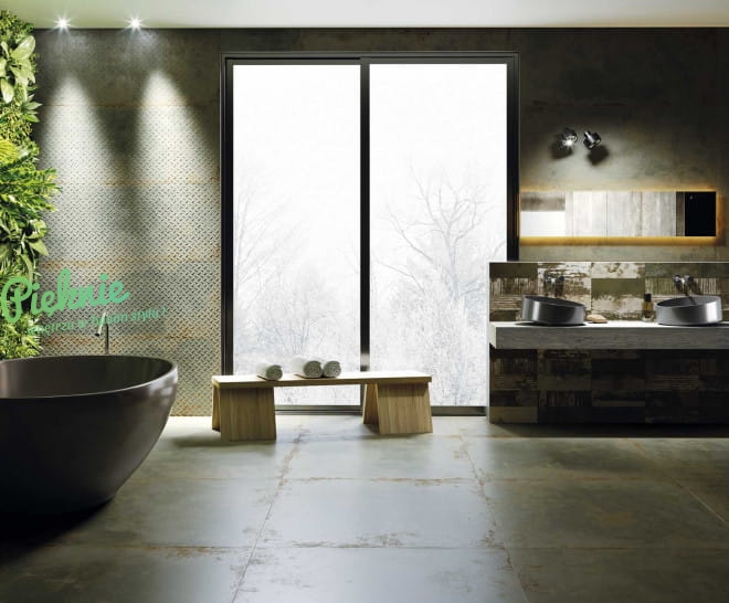 Płytki ścienne z kolekcji Flamed marki Aparici. Styl industrialny, imitacja metalu.