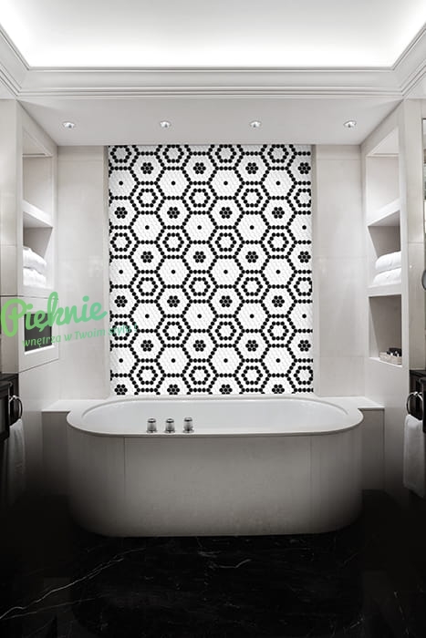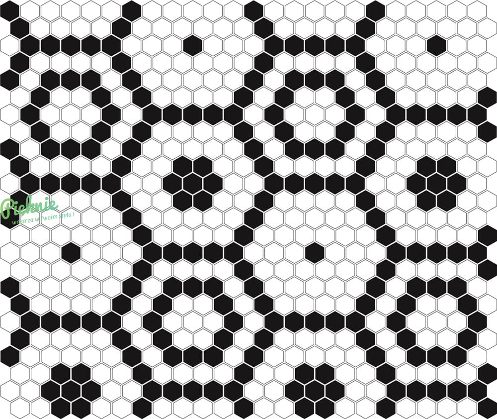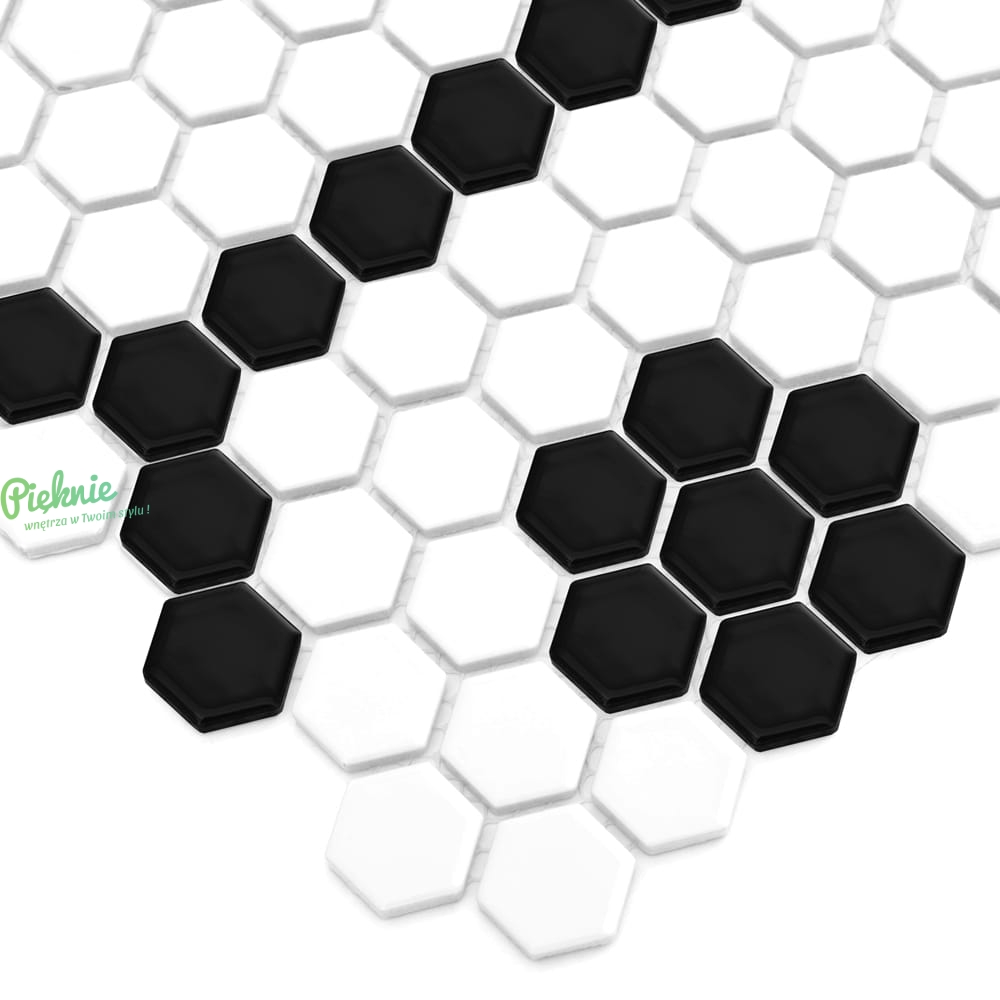 Sześciokątna mozaika w kształcie plastra miodu. Heksagonalne, błyszczące płytki ułożone na siatce z włókna szklanego tworzą biało-czarny, geometryczny wzór nawiązujący do podłóg w nowojorskich kamienicach. Ponadczasowa klasyka. Produkcja na zamówienie, termin realizacji zależny od marki Dunin.