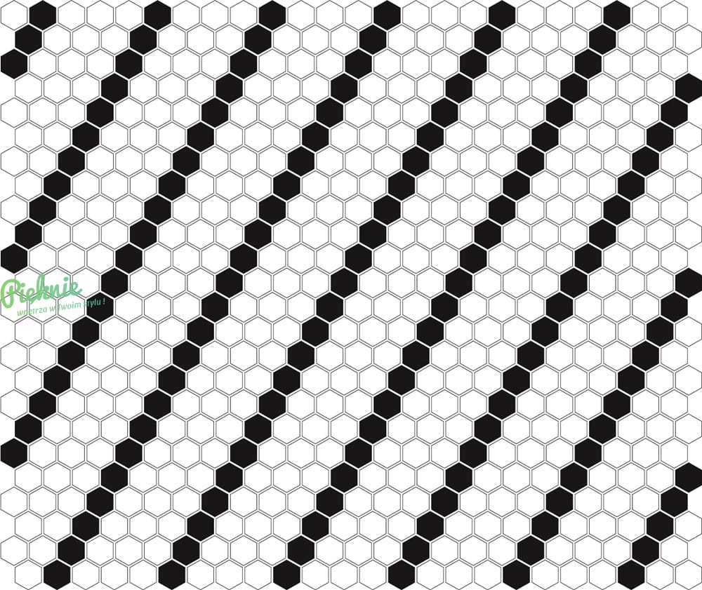 Sześciokątna mozaika w kształcie plastra miodu. Heksagonalne, błyszczące płytki ułożone na siatce z włókna szklanego tworzą biało-czarny, geometryczny wzór nawiązujący do podłóg w nowojorskich kamienicach. Ponadczasowa klasyka. Produkcja na zamówienie, termin realizacji zależny od marki Dunin.