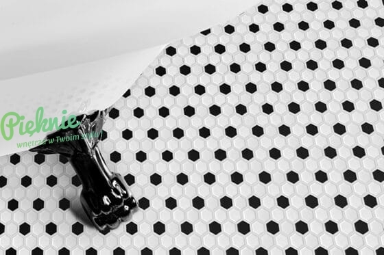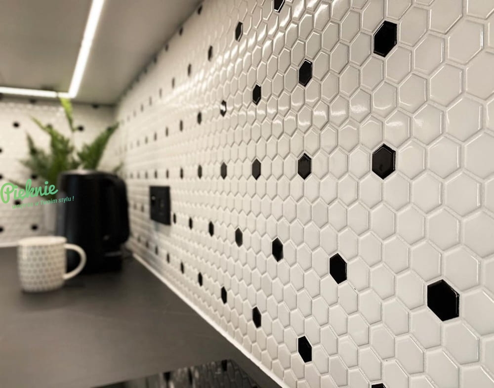 Sześciokątna mozaika w kształcie plastra miodu. Heksagonalne, błyszczące płytki ułożone na siatce z włókna szklanego tworzą biało-czarny, geometryczny wzór nawiązujący do podłóg w nowojorskich kamienicach. Ponadczasowa klasyka. Produkcja na zamówienie, termin realizacji zależny od marki Dunin.