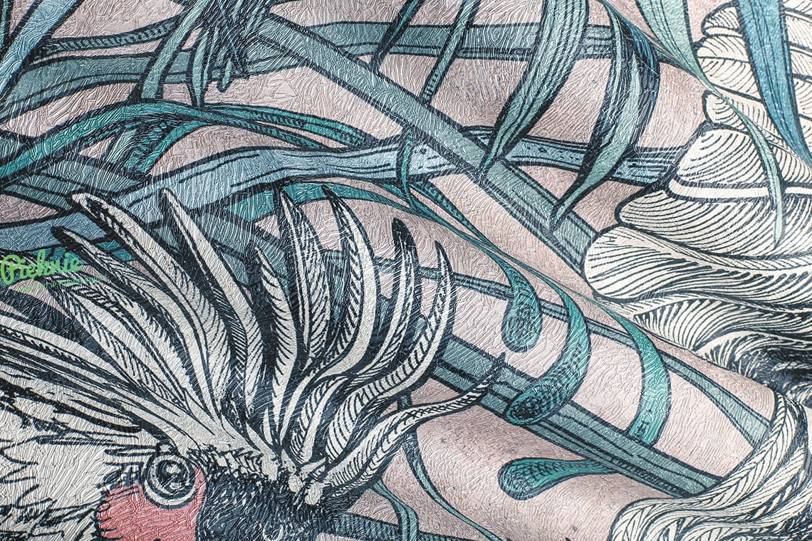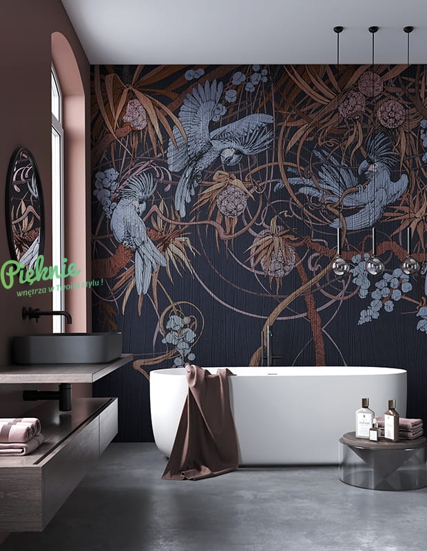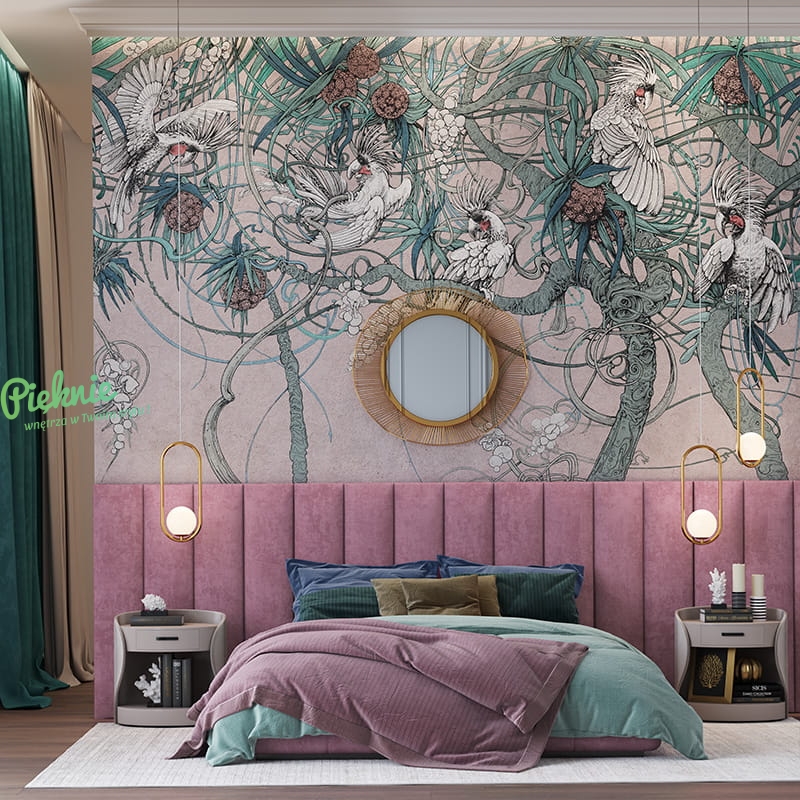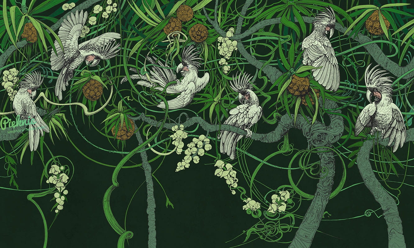 Tapeta fizelinowa z egzotycznymi ptakami.