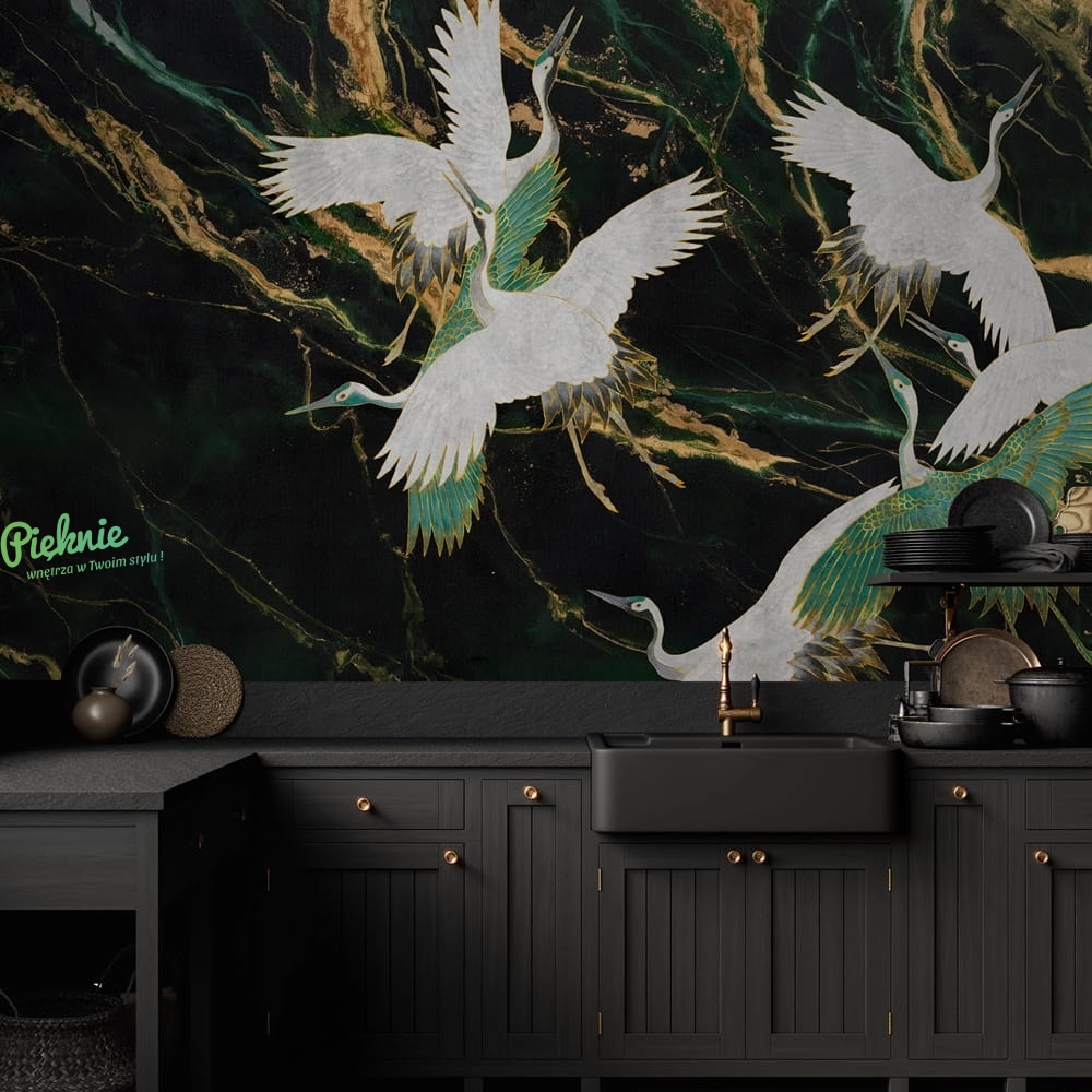 Emerald Tsuru żurawie w locie Wall Art fototapeta na wymiar indywidualny - akcent zielony