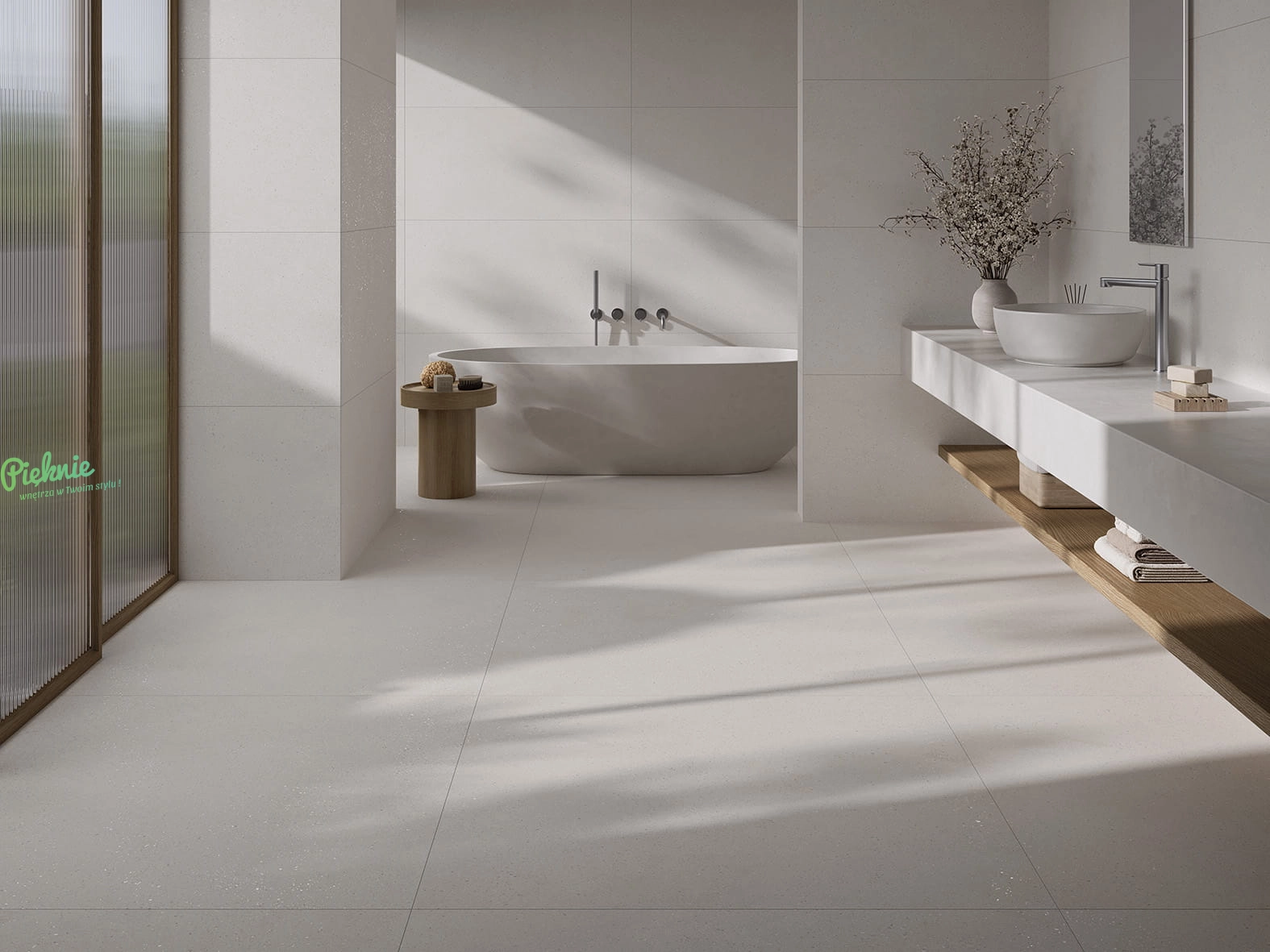 Calm to połączenie elegancji i ponadczasowego stylu. Delikatna, stonowana kolorystyka utrzymana w odcieniach bieli, szarości i beżu nadaje wnętrzom harmonię oraz wyrafinowany charakter, tworząc przestrzeń pełną równowagi i spokoju. Subtelny wzór cementu nie dominuje aranżacji, stanowi eleganckie tło dla różnych stylów – od nowoczesnego minimalizmu, przez skandynawską prostotę, po klasyczne wnętrza. Kolekcja Calm dostępna jest w rozmiarach: 120x120, 90x90 oraz 60x120. Uzupełniają ją dekory ścienne Oasis (tłoczone kwiaty), Sonar (prążki) oraz Floris (malowane, pastelowe kwiaty).