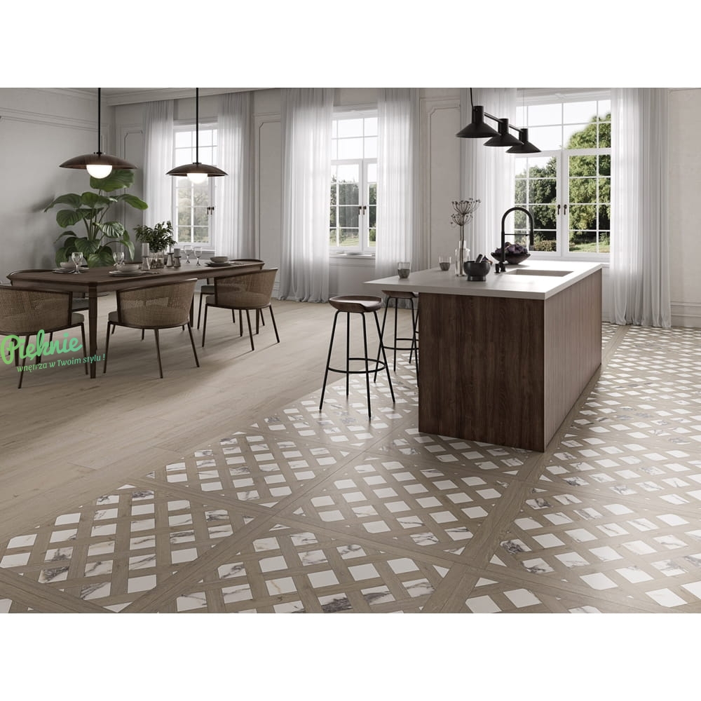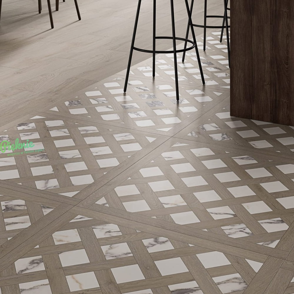 Płytki Fanal z kolekcji Opera w wersji dekoracyjnej, imitującej drewniany parkiet z marmurowymi wstawkami. Gres z efektem 3D Soft, podkreślającym wzór marmuru oraz struktury drewna.