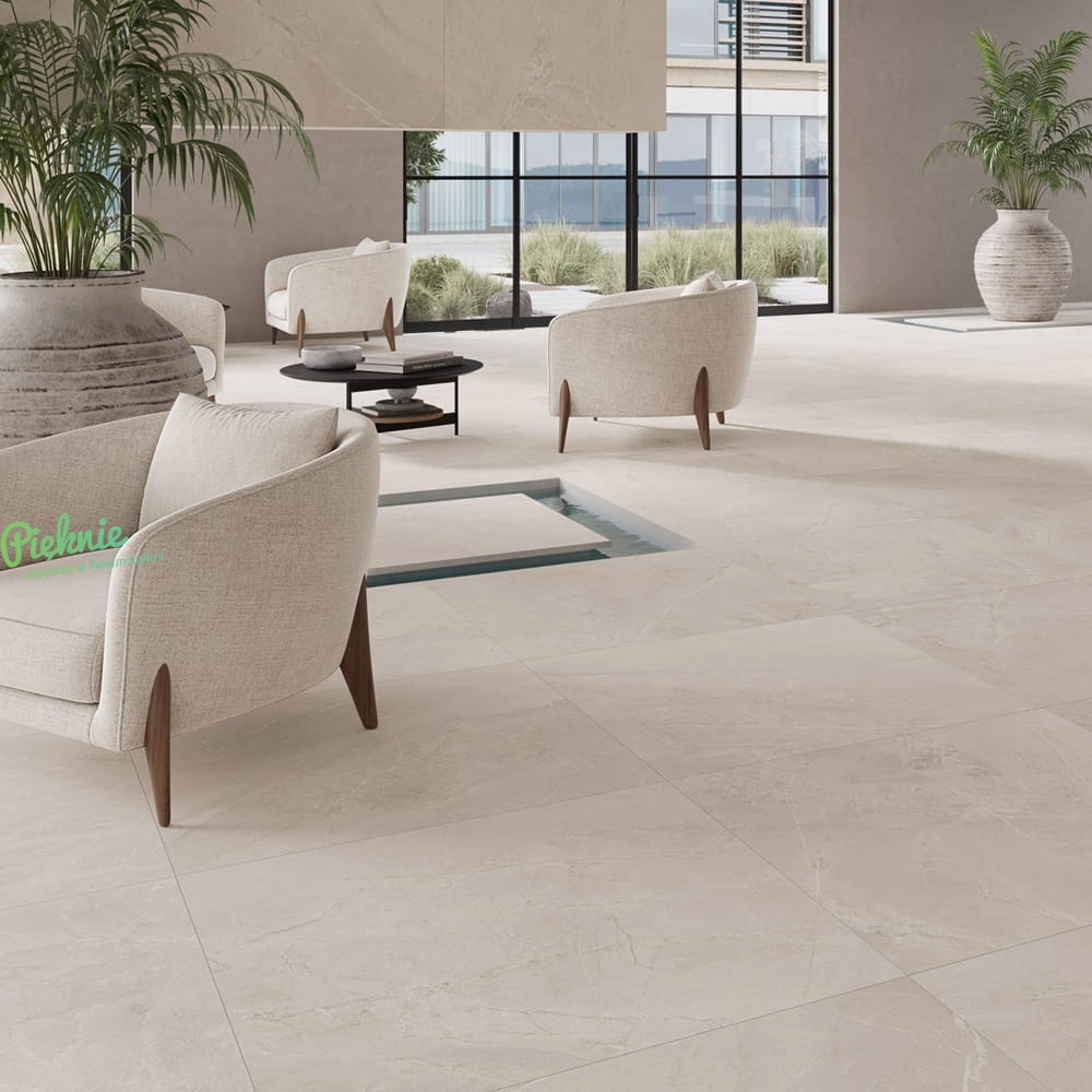 Płytki Fanal z kolekcji Moon imitujące marmur z jasną żyłą. Wykończenie lappato 3DSoft, pięknie imitujące kamień.