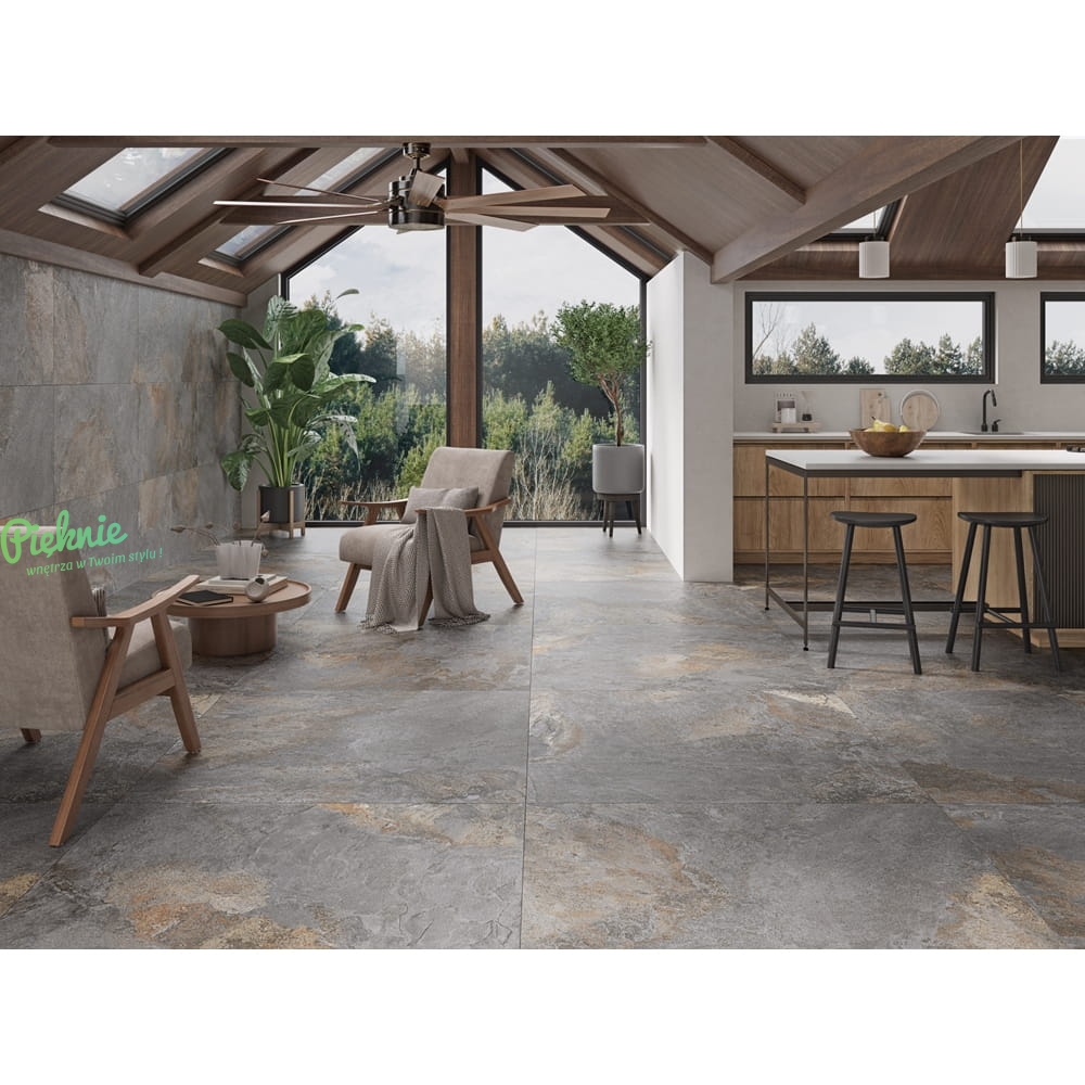 Płytki Fanal z kolekcji Nebula, utrzymane w industrialnej stylistyce. Kolekcja inspirowana łupkiem o metalicznym, strukturalnym wykończeniu.