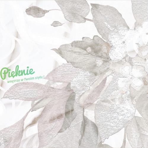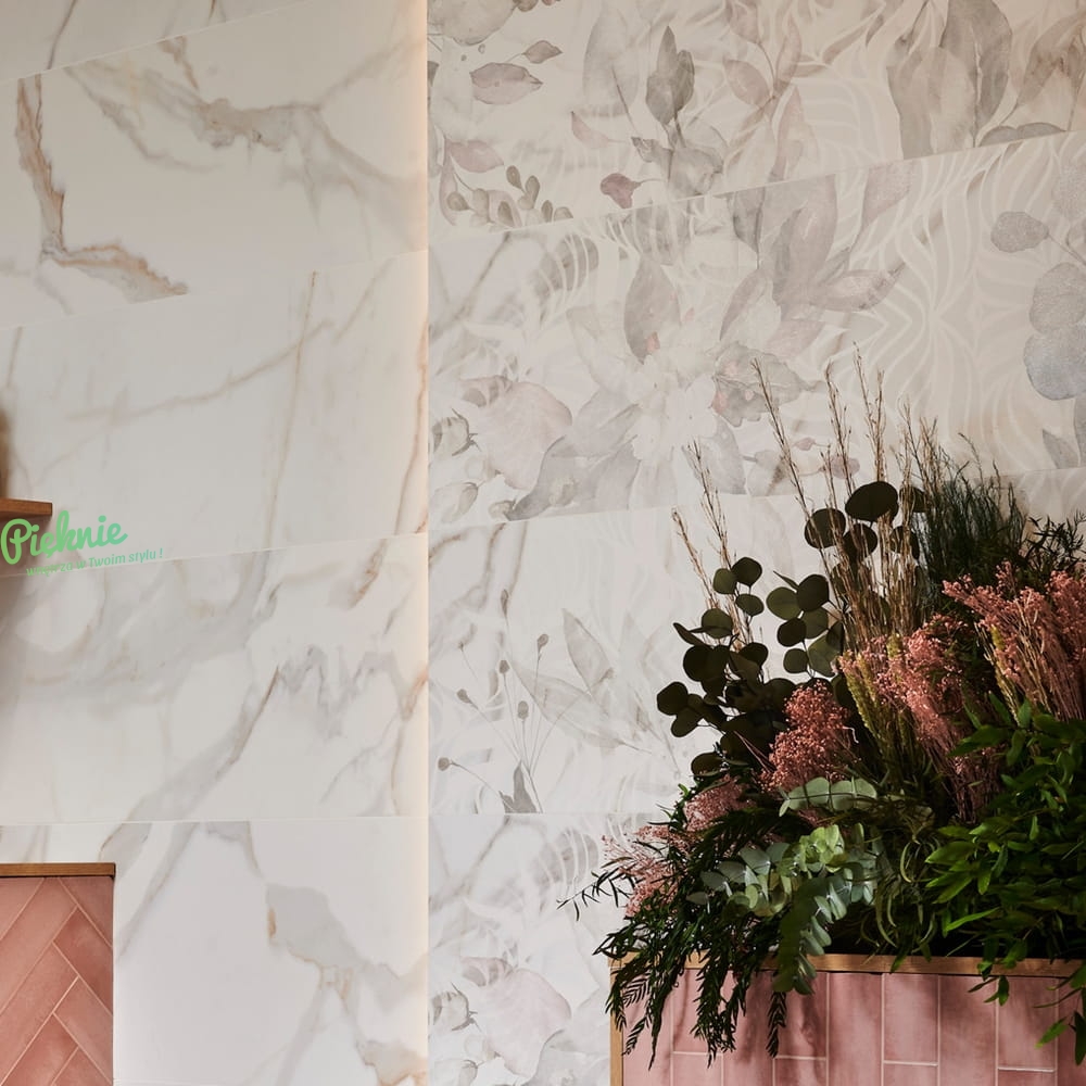 Dekoracyjne płytki ścienne w pastelowy wzór liści i kwiatów, delikatnie podkreślonych strukturą.