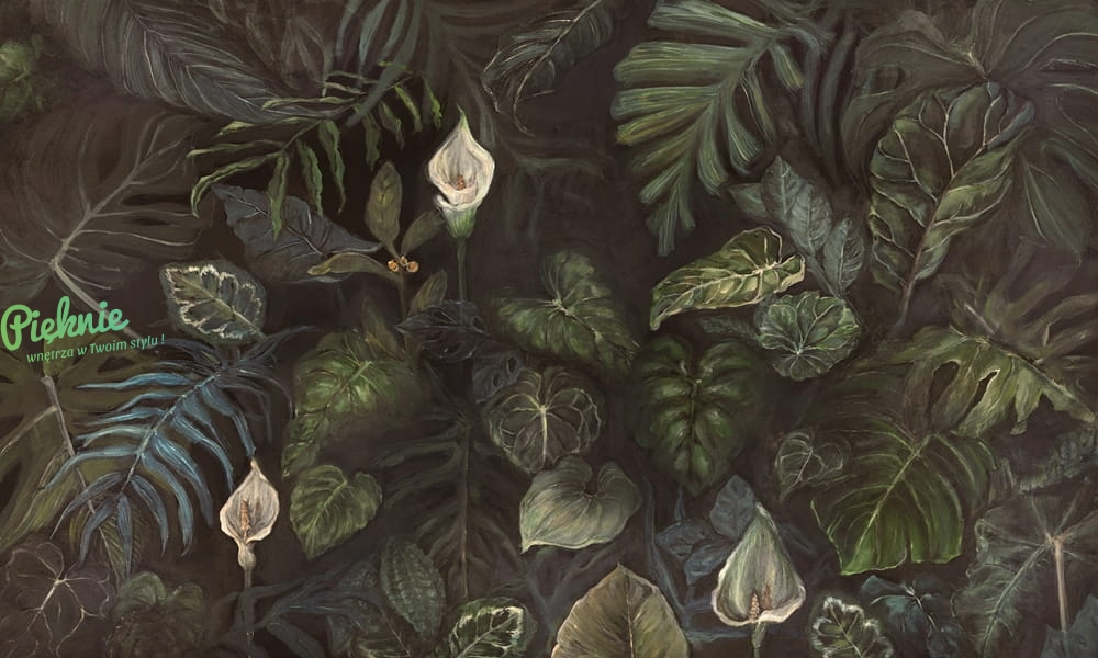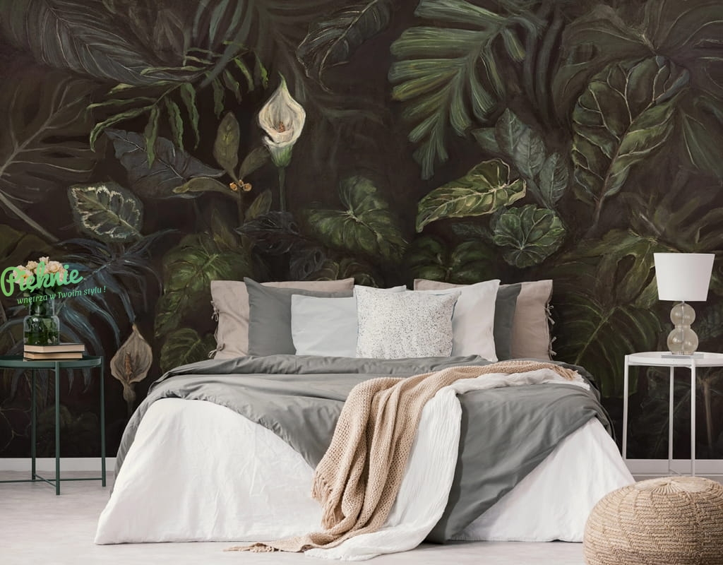 Kalia i tropikalne liście Wall Art ciemnozielona fototapeta z egzotycznym motywem