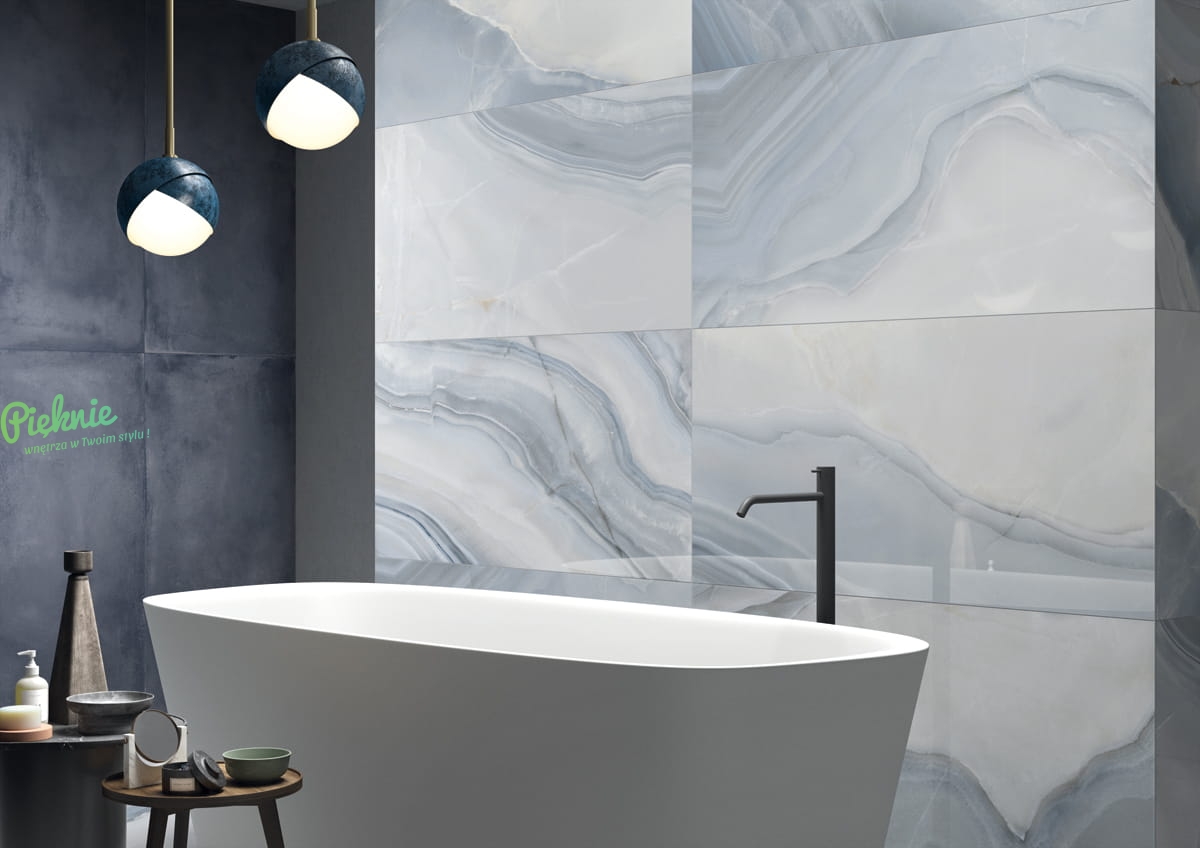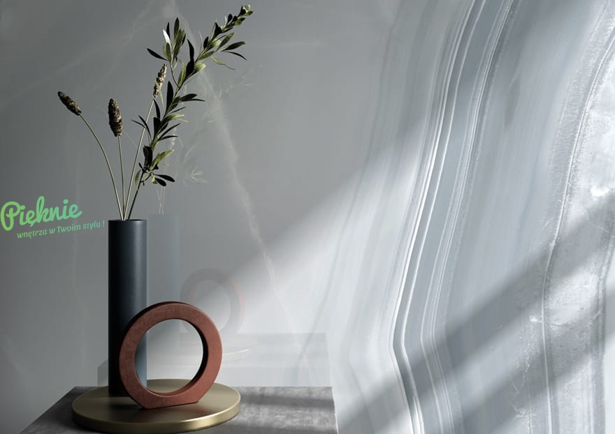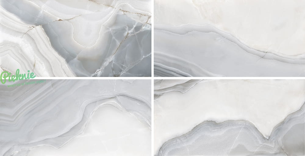 Ocean Blue (OCE) - spektakularny onyks z Azji Środkowej, w którym podziały między warstwami są bardzo wyraźne. Szarawo-brązowe odcienie mieszają się z chłodniejszymi, białawymi wtrąceniami, podkreślonymi tu i ówdzie kolorami ochry i złota.