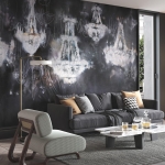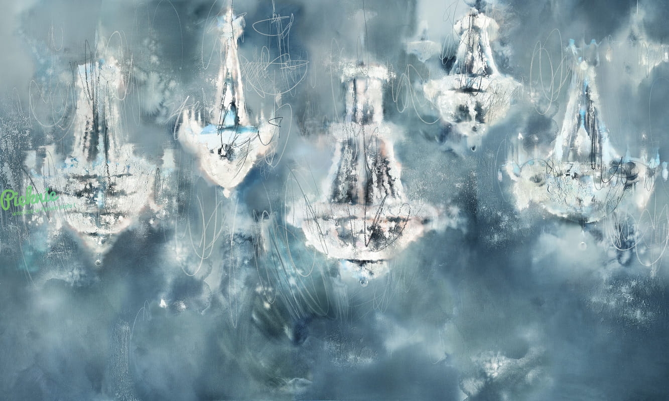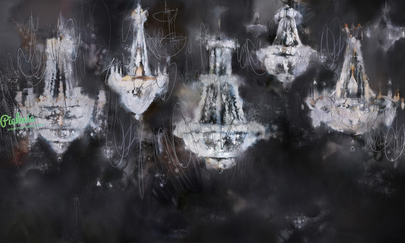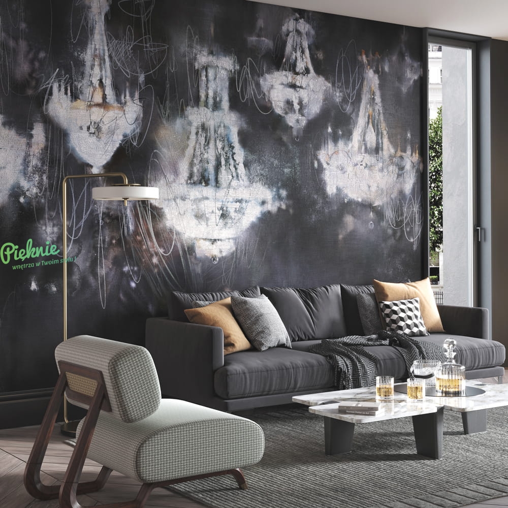 Tapeta ścienna z rozświetlonymi żyrandolami.