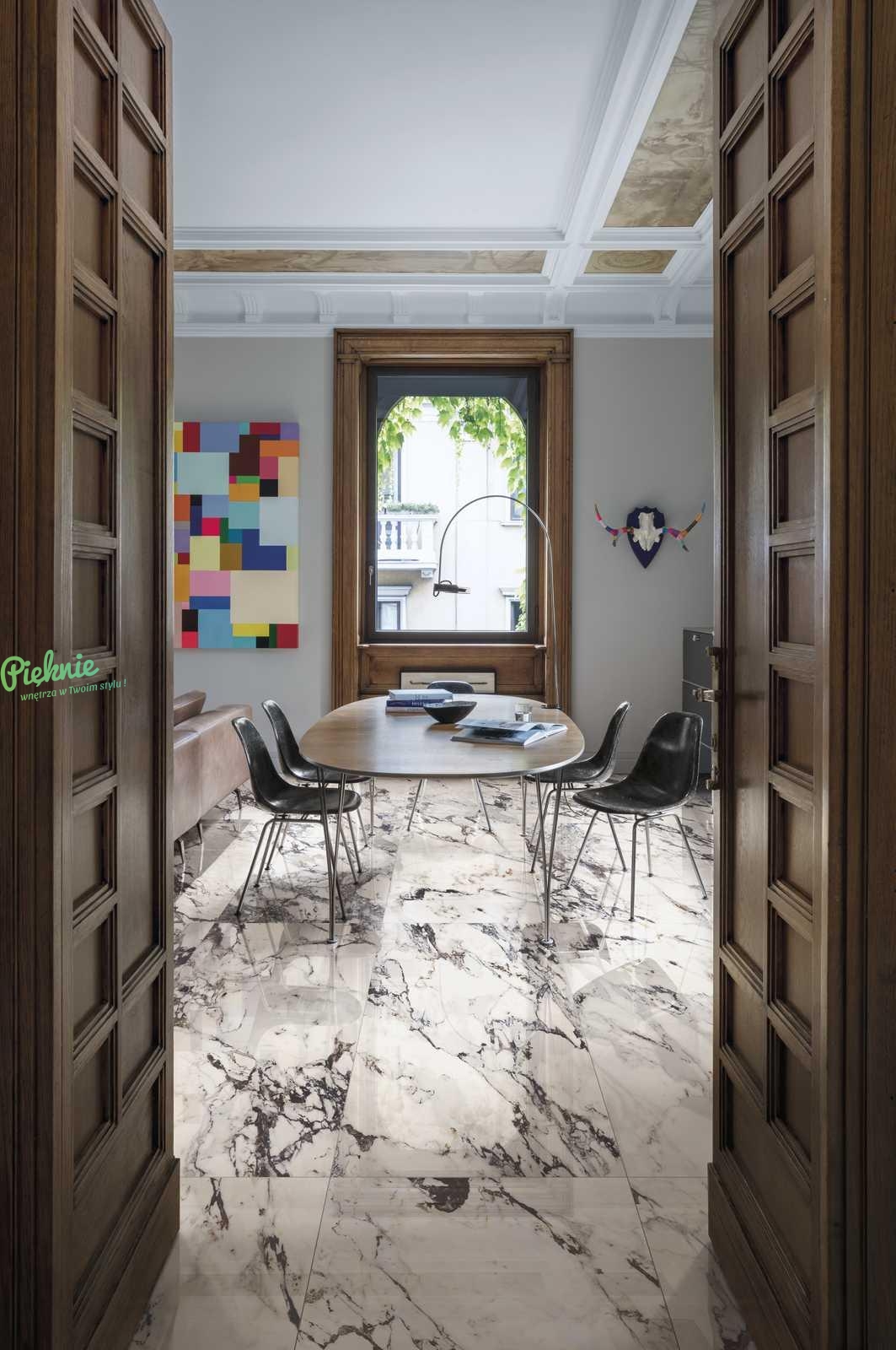 Elegancka płytka imitująca jasny marmur z ciemnymi akcentami marki Marazzi.
