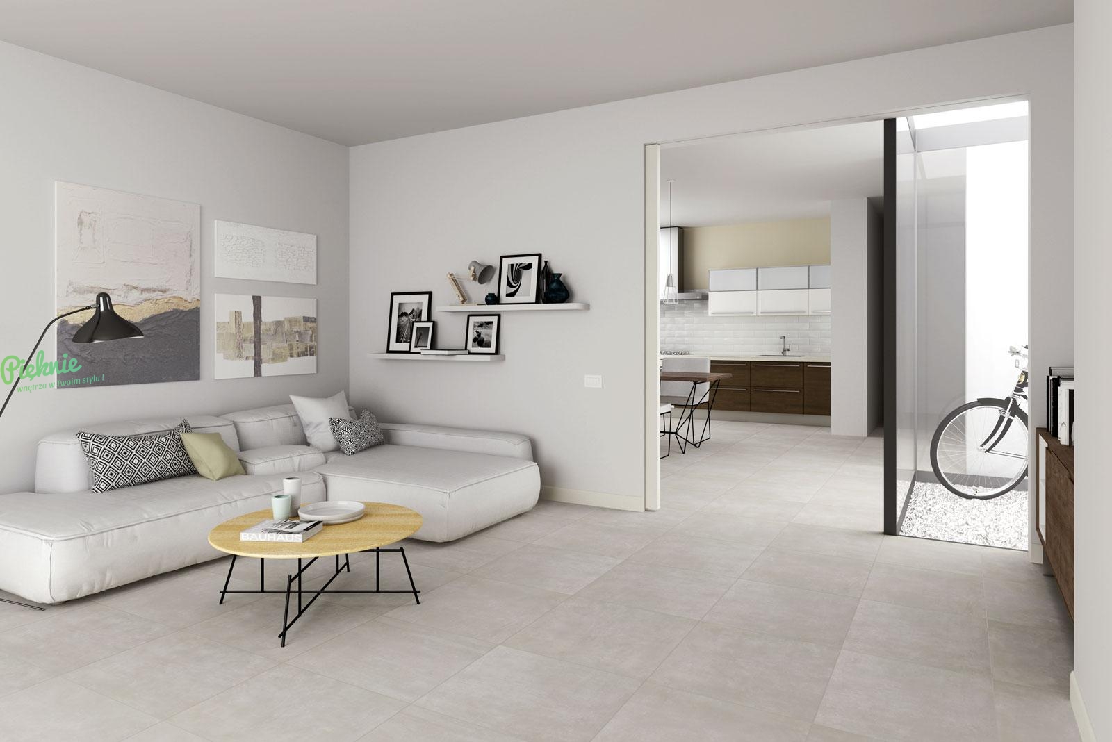 Płytki gresowe marki Marazzi z kolekcji Dust, imitujące beton.