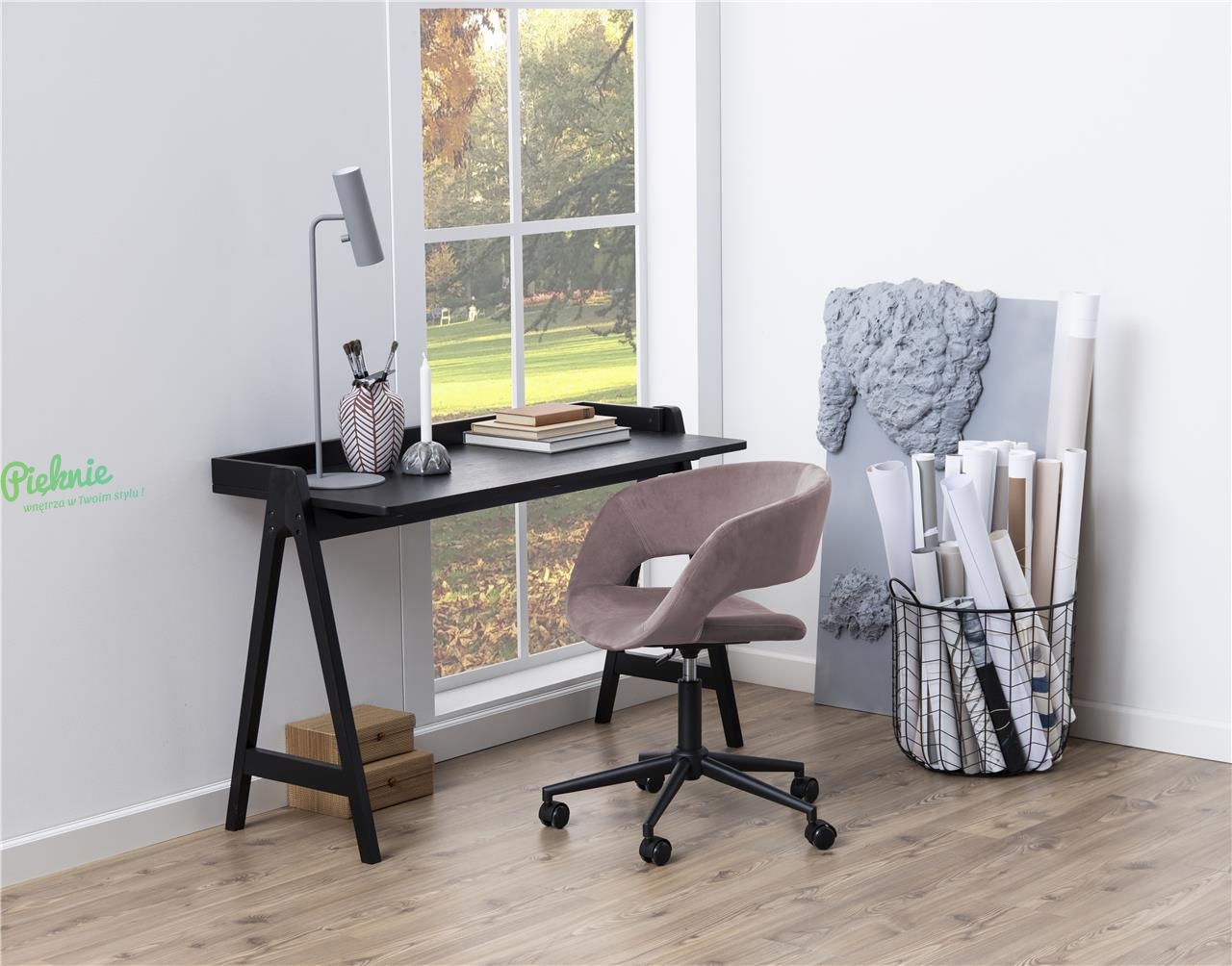 Designerskie czarne biurko w stylu skandynawskim.