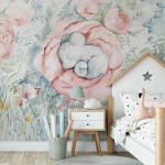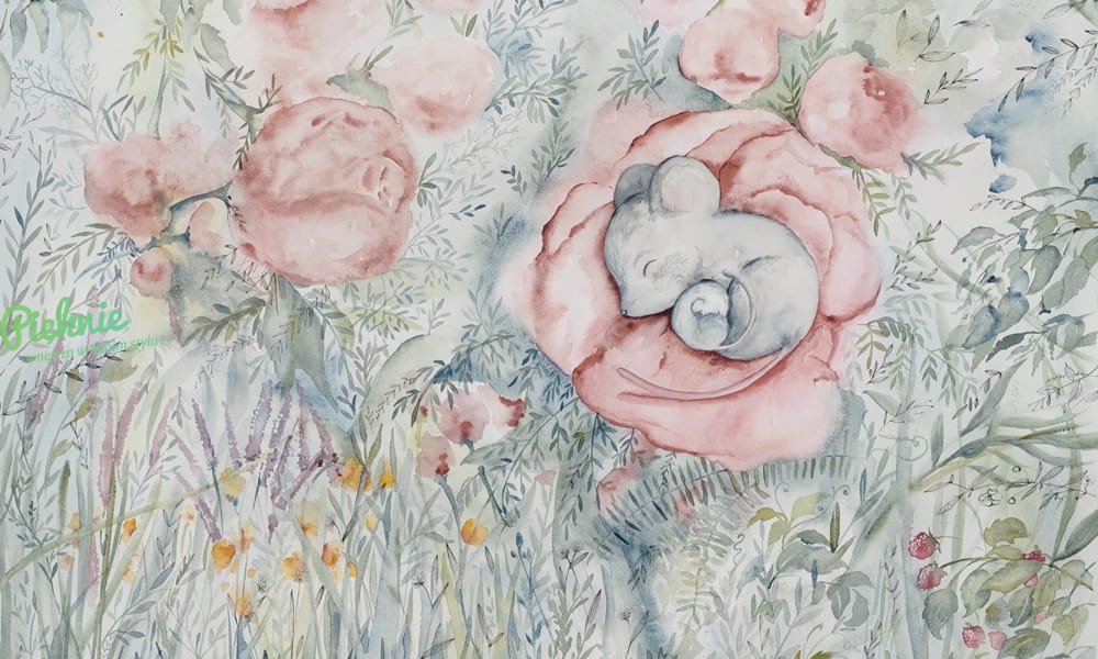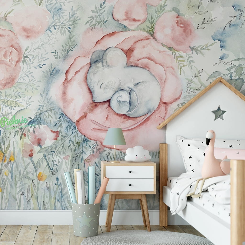 Myszki śpiące wśród kwiatów i traw pastelowa fototapeta do pokoju dziecięcego - na wymiar