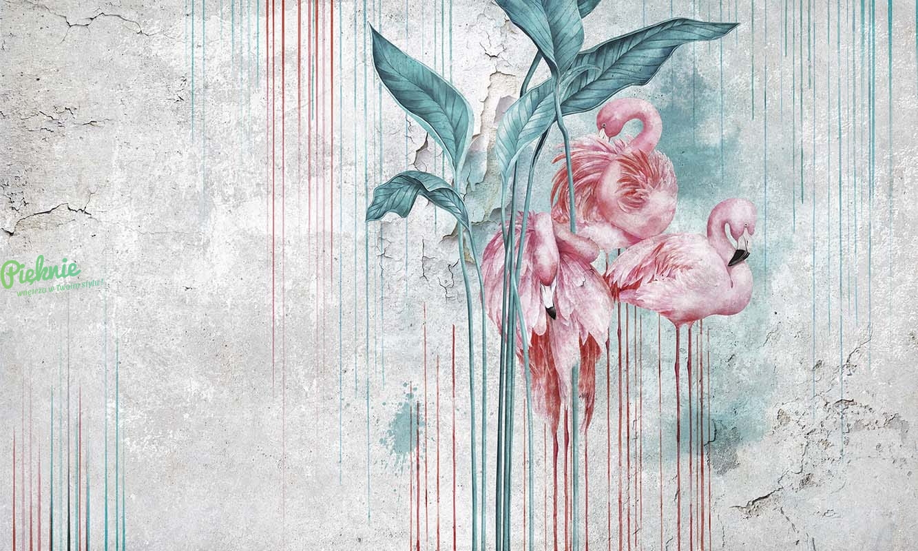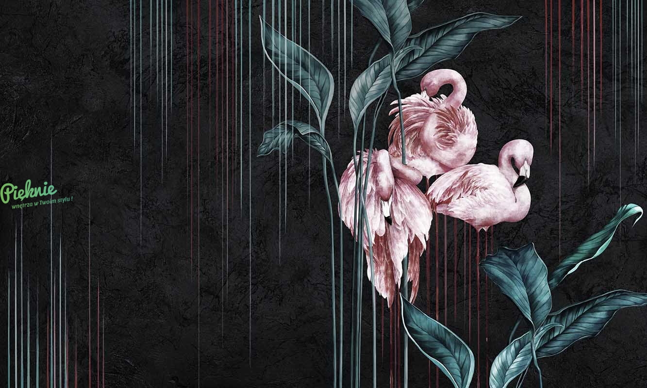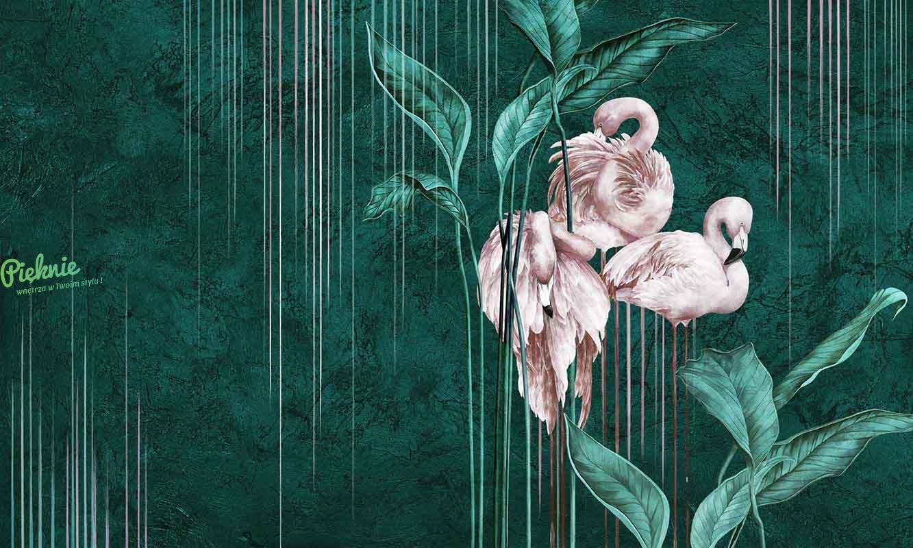 Oryginalna tapeta fizelinowa z flamingami i liśćmi.