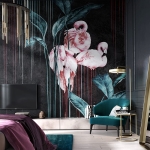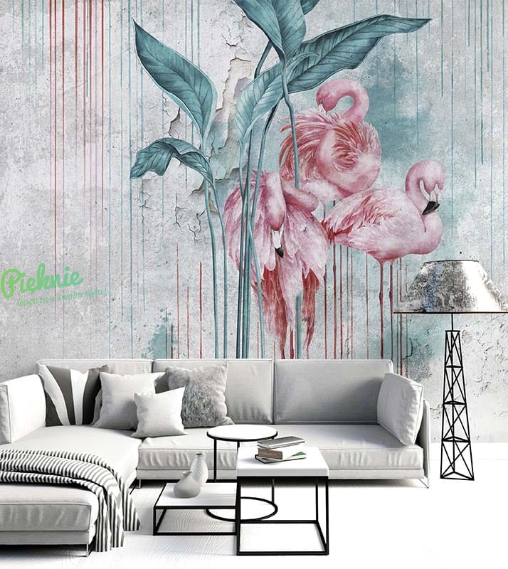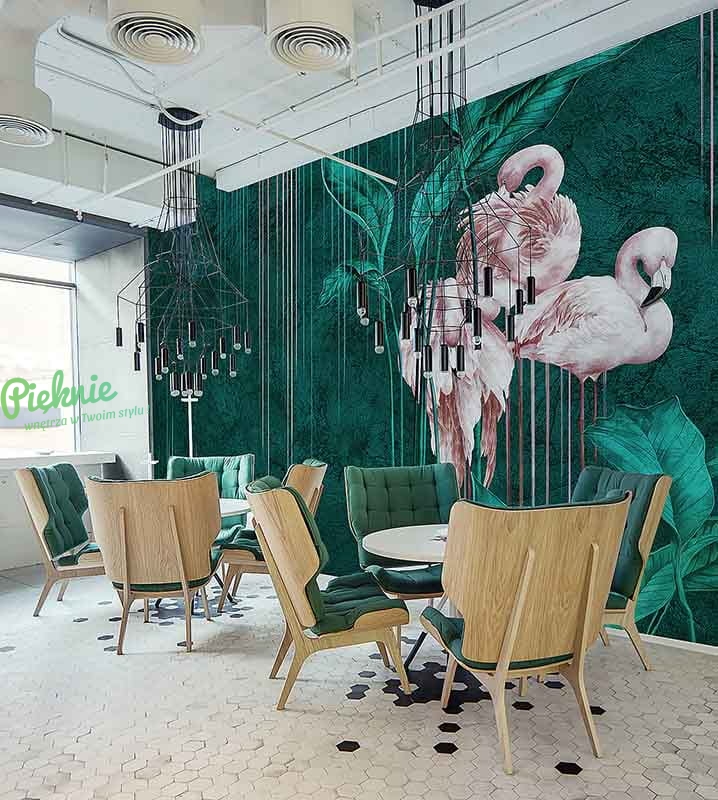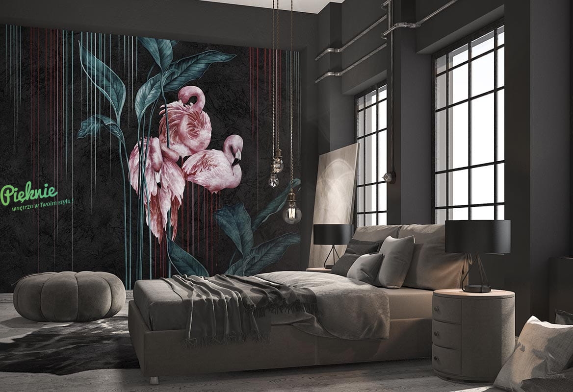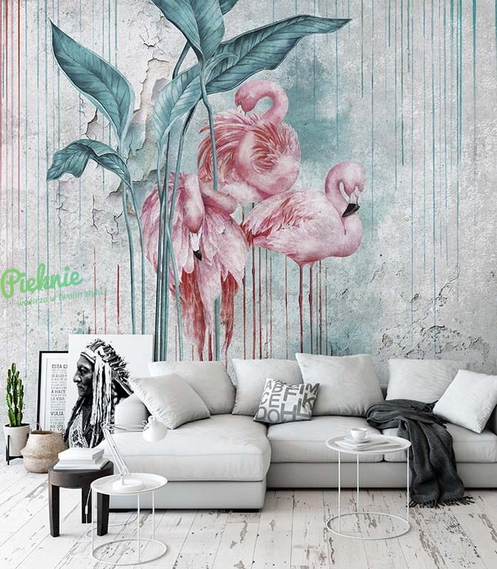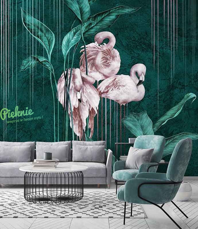 Oryginalna tapeta fizelinowa z flamingami i liśćmi.