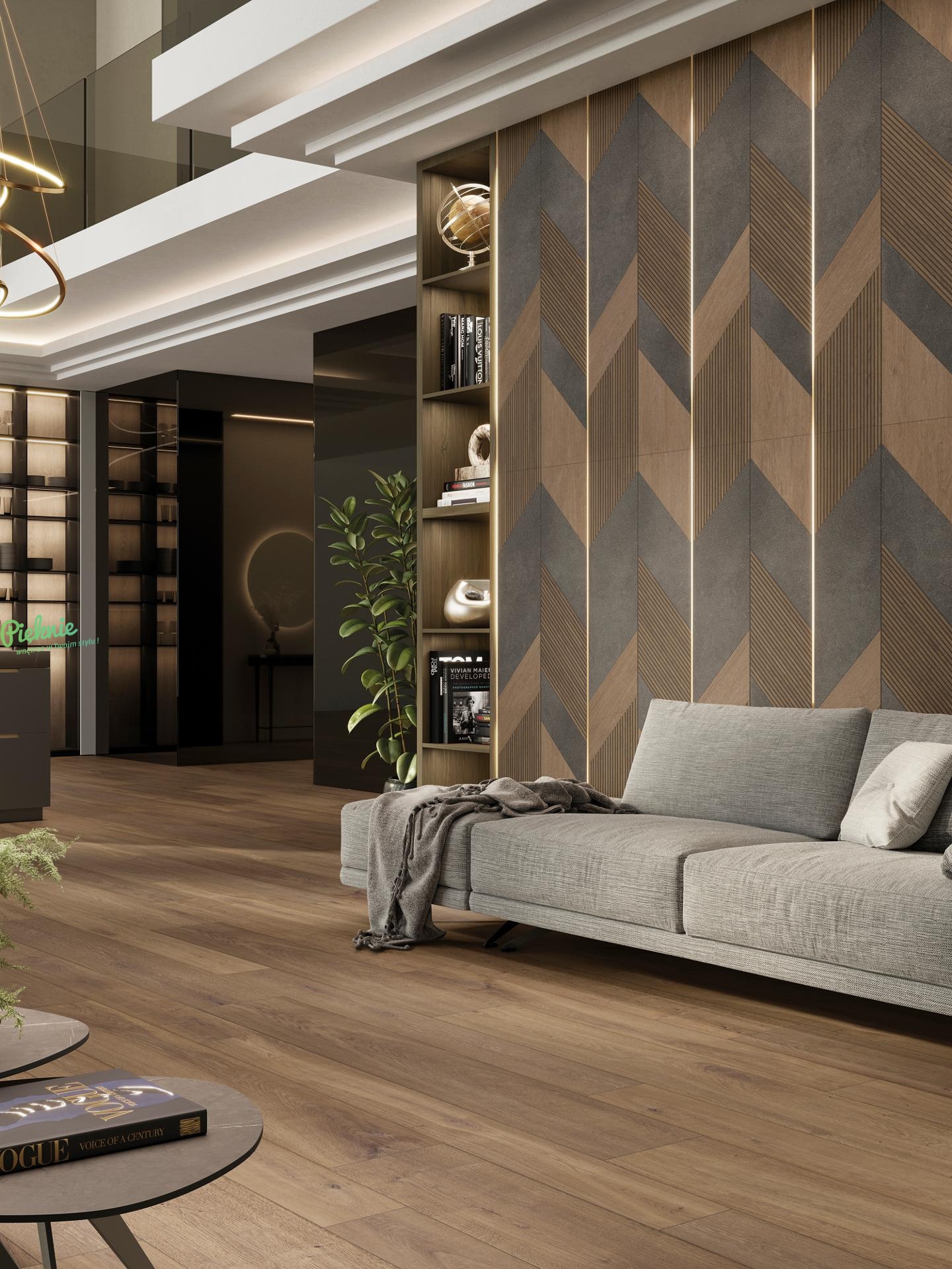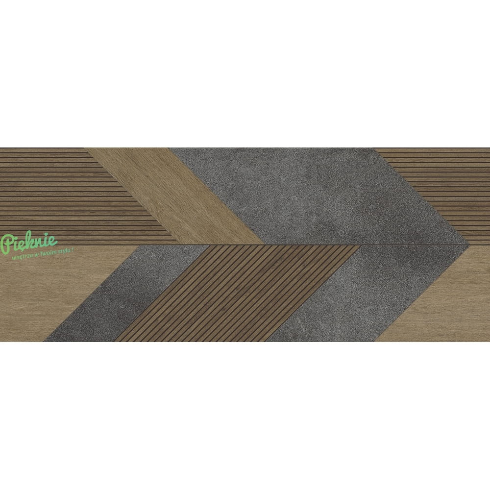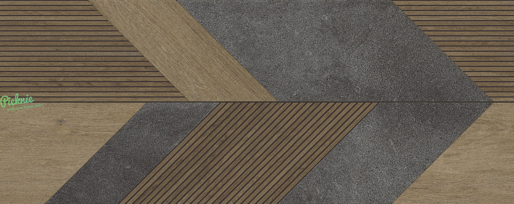 Dekor ścienny Porcelanosa Gent Stone 3D Roble. Geometryczna płytka imitująca drewno połączone z kamieniem.