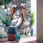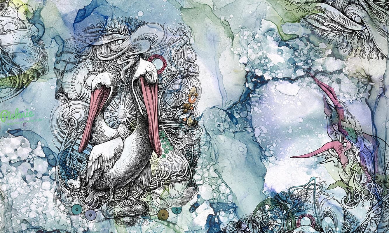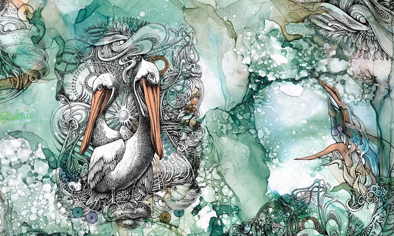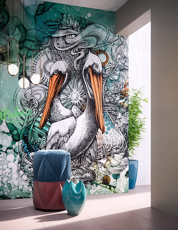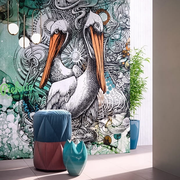 Tapeta ścienna z motywem morskich stworzeń i pelikanów.