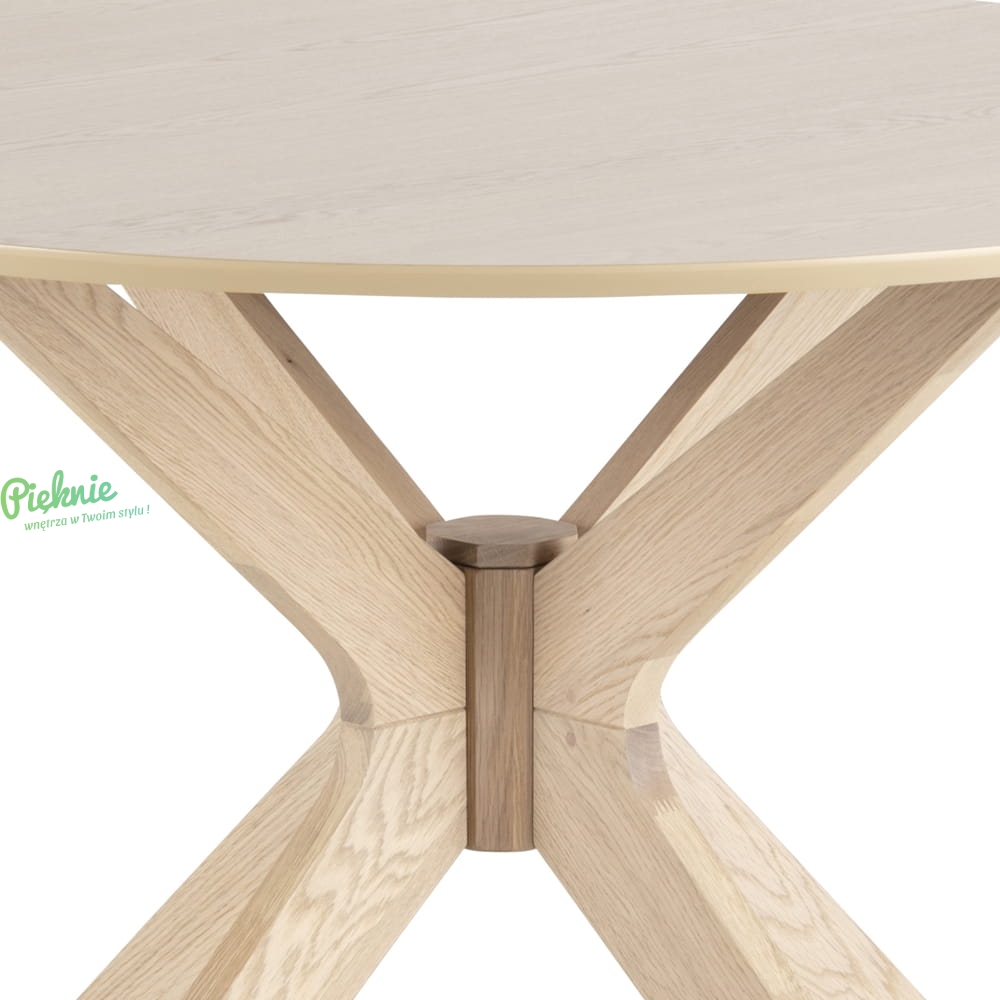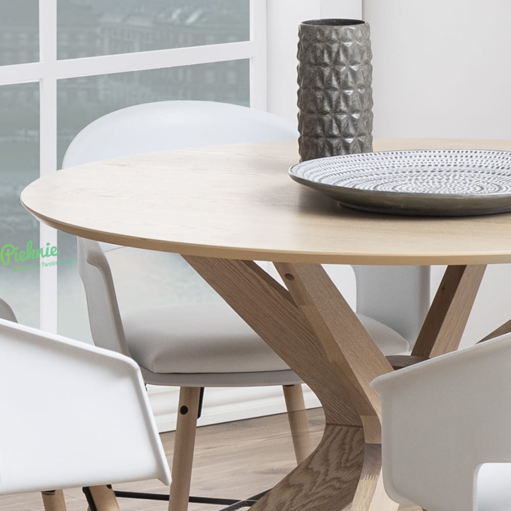 Okrągły blat pokryty dębowym fornirem spoczywa na solidnej, krzyżowej podstawie z litego drewna dębowego. Stół świetnie spisze się w salonie, kuchni lub jadalni utrzymanej w stylistyce klasycznej i skandynawskiej.