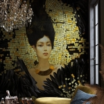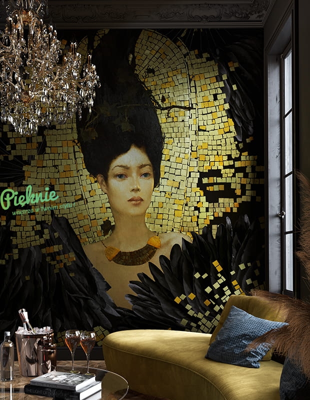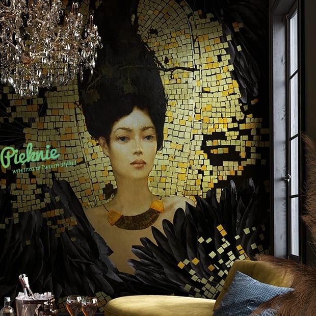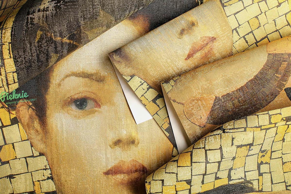 Tapeta z wizerunkiem pięknej kobiety na tle złotej mozaiki.