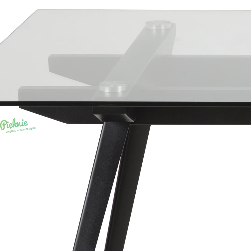 Stół z szklanym blatem i metalową podstawą.