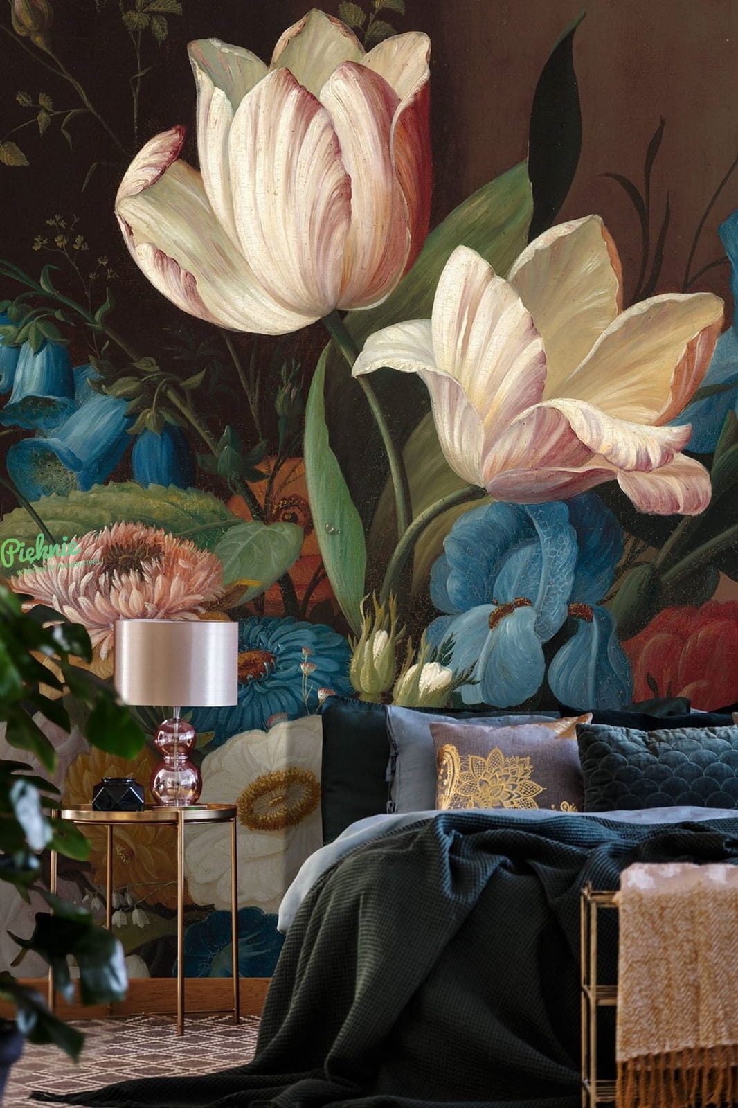 Tulipany i irysy kwiaty na ciemnym tle Dark Tulip Wall Art fototapeta na wymiar indywidualny