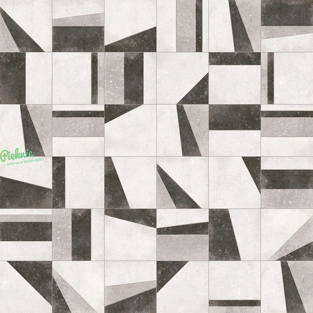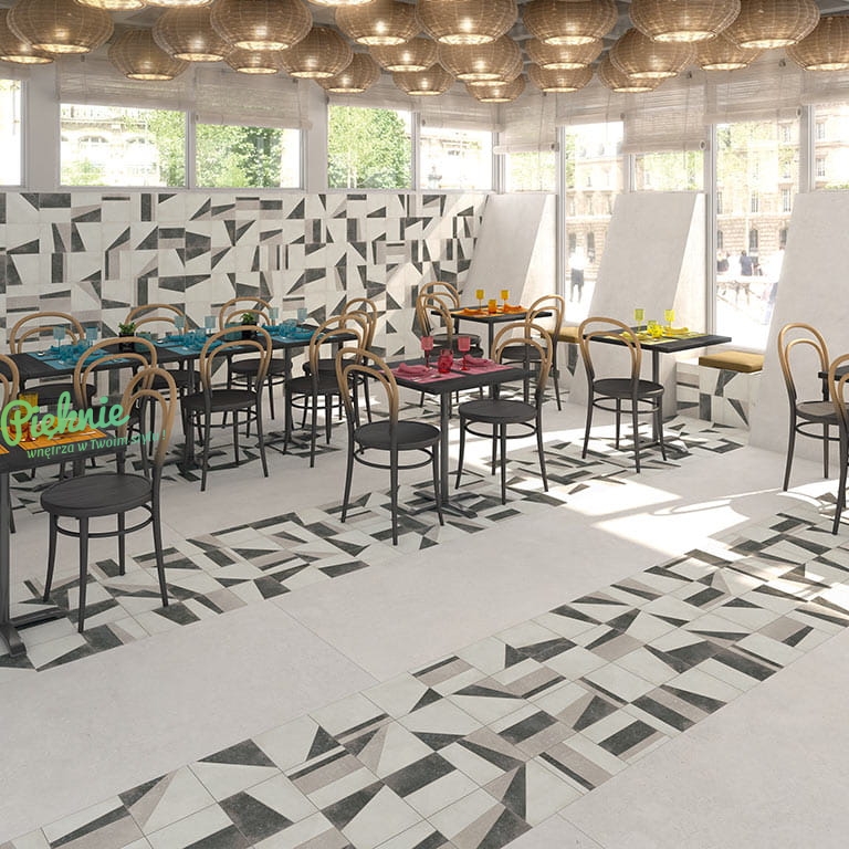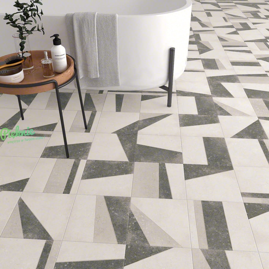 Dekoracyjne płytki gresowe marki Vives o geometrycznych wzorach.