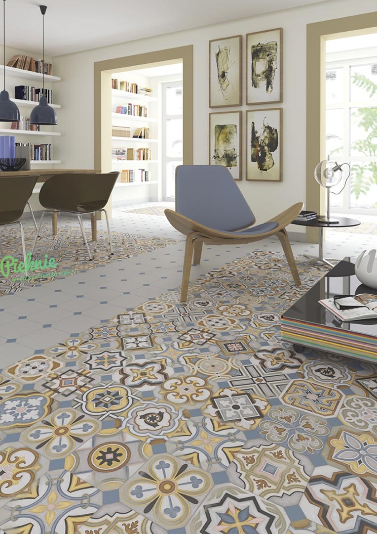 Kafelki uniwersalne Vives Vodevil z dekoracyjnym wzorem. Dzięki matowej powierzchni świetnie spiszą się w kuchni, łazience i korytarzu. Mix wzorów, pakowane losowo. Uwaga: brzegi płytki ścięte, do wypełnienia płytką Vives Taco (produkty powiązane).