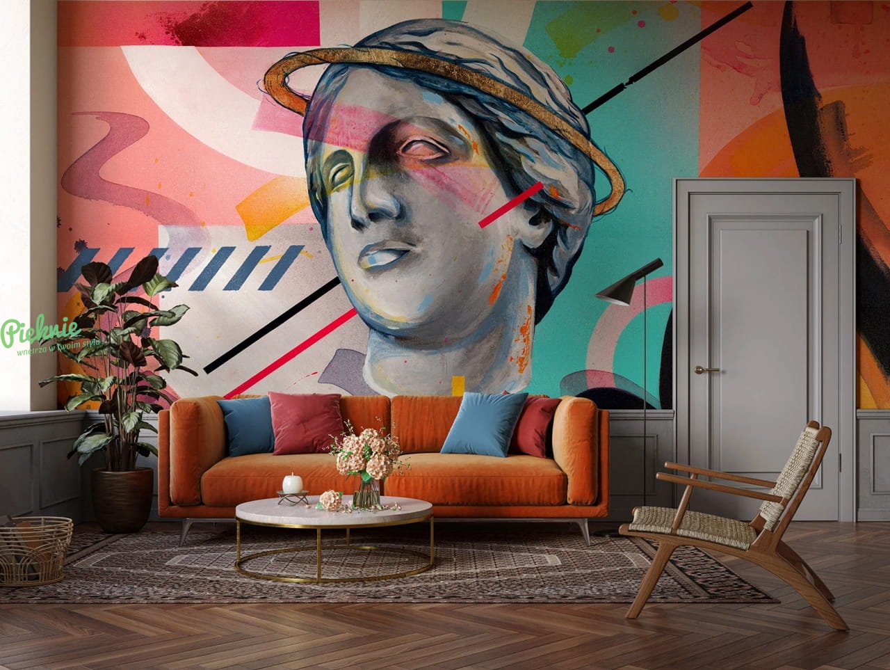 Aires to dynamiczna, soczysta kompozycja, w której centralnym punktem jest klasyczna marmurowa rzeźba głowy. Popiersie, przedstawiające klasyczne rysy twarzy, jest realistycznie odwzorowane, ale jednocześnie zintegrowane z abstrakcyjnym, kolorowym tłem. Trudno oderwać wzrok od tła Aires, pełnego różnorodnych tekstur i technik malarskich. Widać tu delikatne rozpryski farby, subtelne gradienty kolorów oraz intensywne, grube pociągnięcia pędzla, które tworzą bogatą, wielowarstwową powierzchnię. Aires to mariaż elementów klasycznej sztuki z nowoczesnym z abstrakcyjnym podejściem. Wzór jest pełen energii i życia, dzięki czemu przyciąga wzrok i skłania do dłuższego zatrzymania się nad jego detalami. Jego intensywna kolorystyka i dynamiczna forma sprawiają, że jest idealny do nowoczesnych wnętrz, gdzie może stanowić centralny punkt dekoracyjny, dodając przestrzeni artystycznego wyrazu i charakteru.