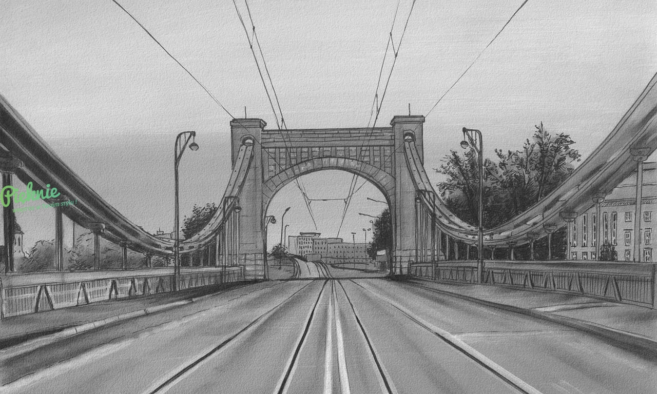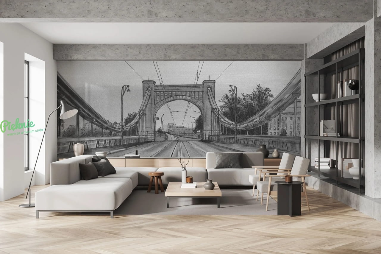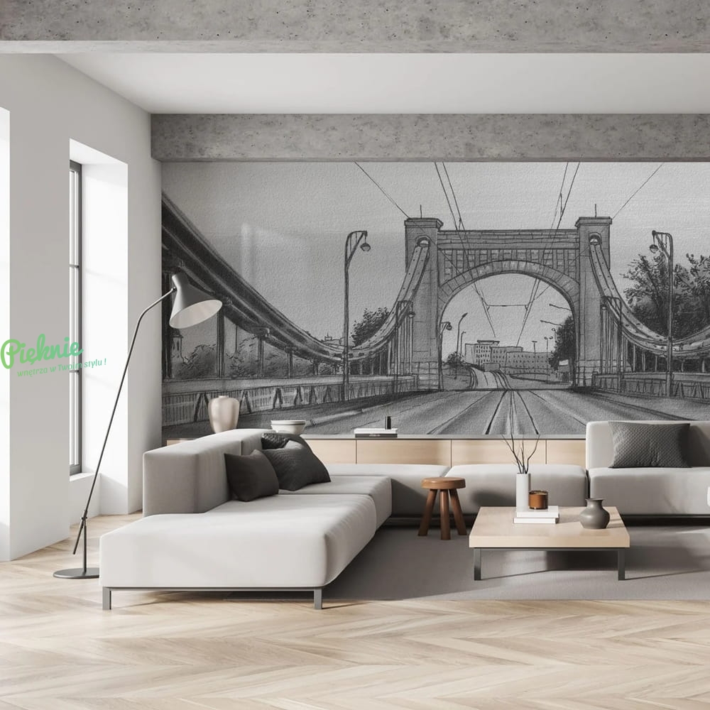 Fototapeta z motywem Mostu Grunwaldzkiego we Wrocławiu, utrzymana w odcieniach w czerni i bieli. Podaj nam wymiary, a my przygotujemy indywidualną wycenę i kadrowanie: info@pieknie.pl