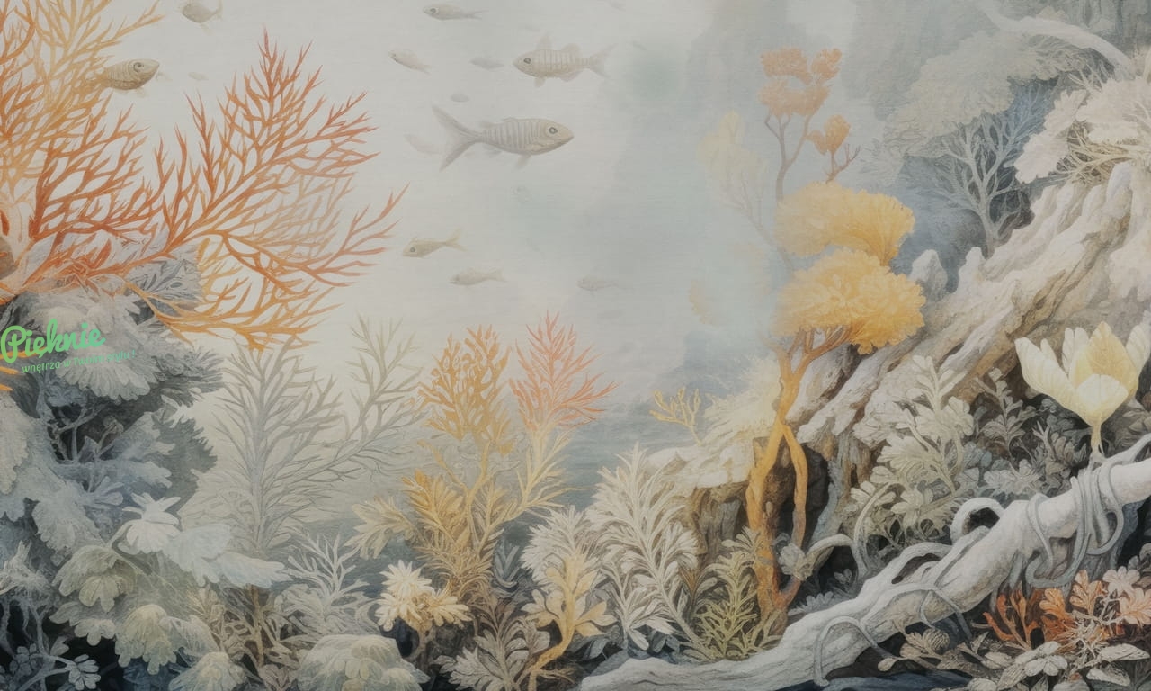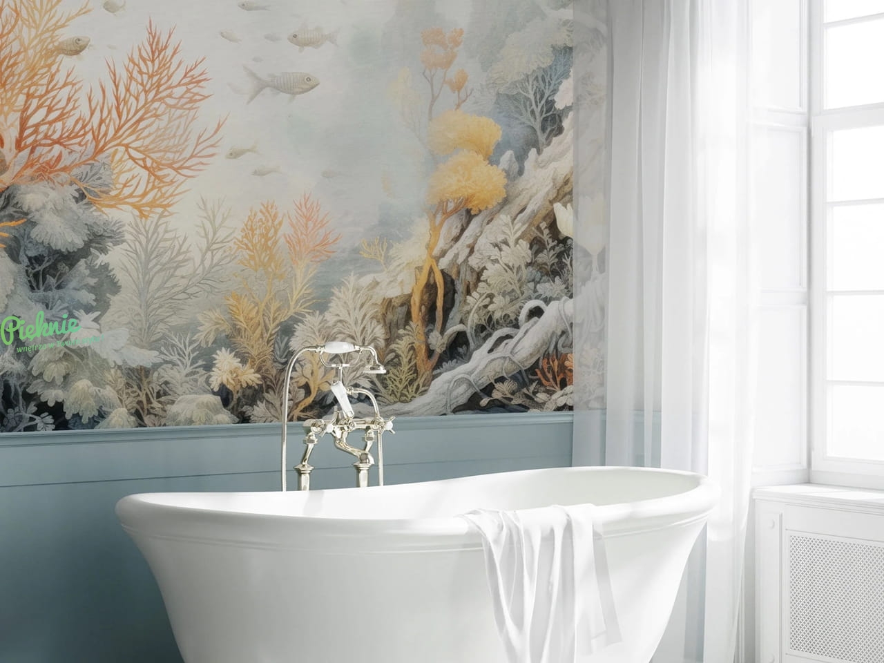 Corallium to wzór z motywem podwodnego świata. Dzięki zastosowaniu stonowanej, pastelowej kolorystyki, krajobraz z głębin ciepłego morza nie jest nachalny i w bardzo delikatny sposób wprowadzi do wnętrza spokój jaki daje obcowanie z podwodną naturą.