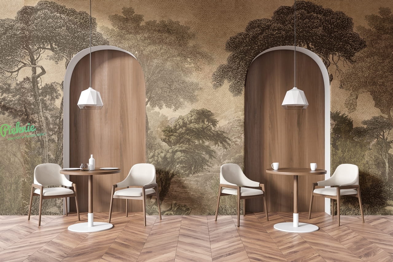 Otoczeni przez rozrastającą się miejską dżunglę, poszukujemy azylu we własnych domach, tworząc przestrzenie zbliżające nas do przyrody. Hood wprowadzi do wnętrza las w niezwykle eleganckim, nieco kolonialnym wydaniu. Widok nawiązujących do starych rycin przedstawia dziki, niezbrukany ludzką ręką starodrzew. Ciepłe zielenie i tło lekko stylizowane na stare ryciny, będą idealnym uzupełnieniem zarówno drewnianych mebli jak i przełamaniem nowoczesnych beży. Perspektywa uchwycona w pejzażu sprawi, że wnętrze nabierze głębi i optycznie się powiększy.