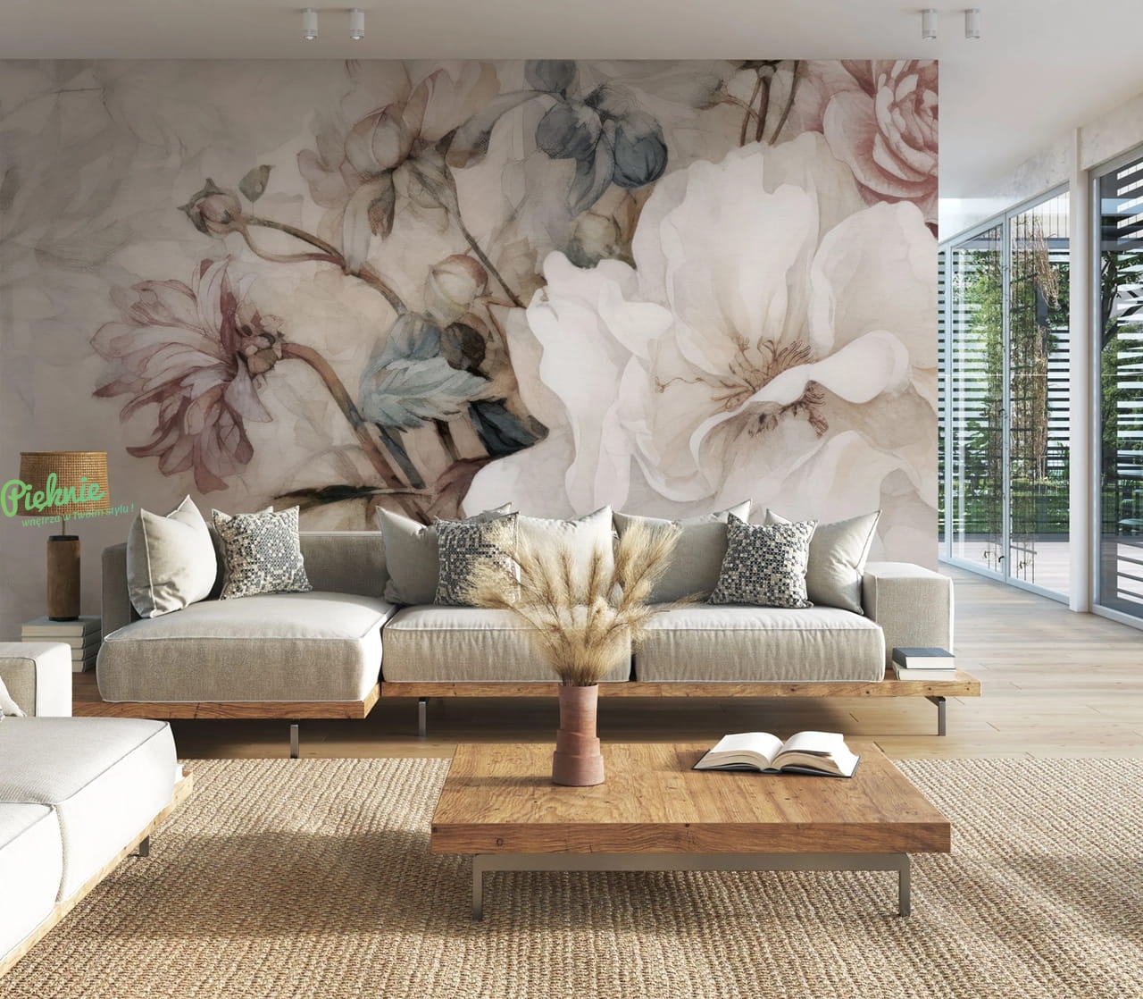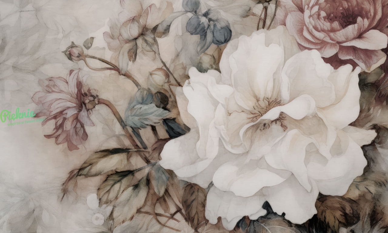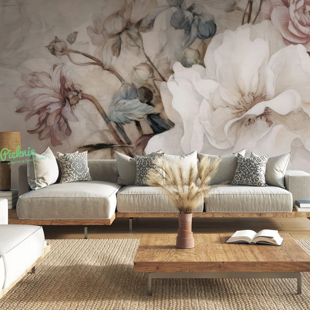 Motywy kwiatowe to mała czarna wystroju wnętrz. Nie wychodzą z mody i cieszą niesłabnącą popularnością od lat. Innocentia to kompozycja kwiatów, które pomimo dużych rozmiarów są jednocześnie bardzo delikatne i nienachalne. Stonowana kolorystyka współgra z drewnianymi dodatkami i naturalnymi tkaninami.