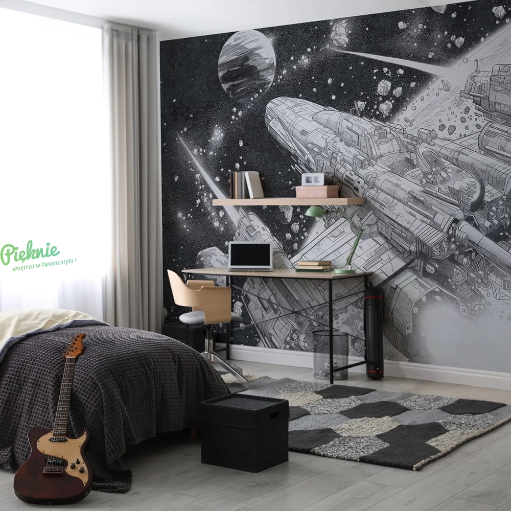 Fototapeta na wymiar indywidualny z komiksowym motywem statku kosmicznego w kosmosie. Idealna do pokoju nastolatka lub do biura. Podaj nam wymiary, a my przygotujemy indywidualną wycenę i kadrowanie: info@pieknie.pl