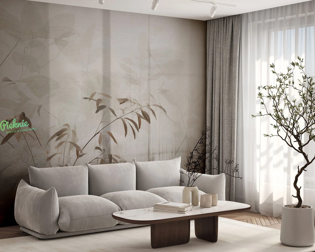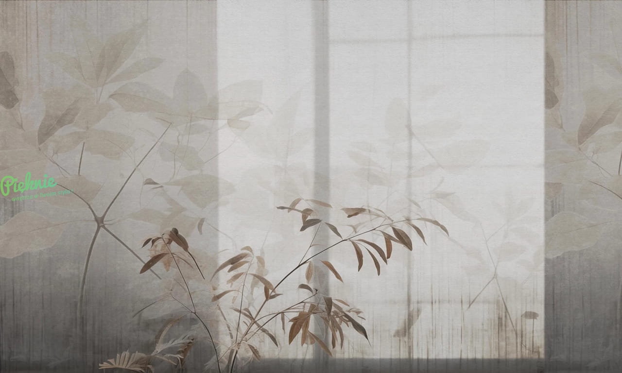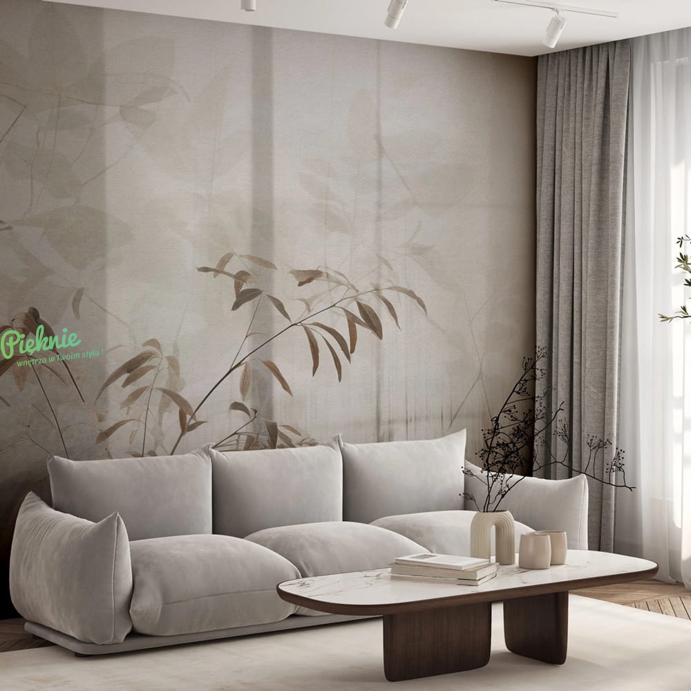 Fototapeta na wymiar indywidualny z motywem delikatnych gałązek z liśćmi. Idealna do salonu, sypialni, korytarza oraz biura. Podaj nam wymiary, a my przygotujemy indywidualną wycenę i kadrowanie: info@pieknie.pl