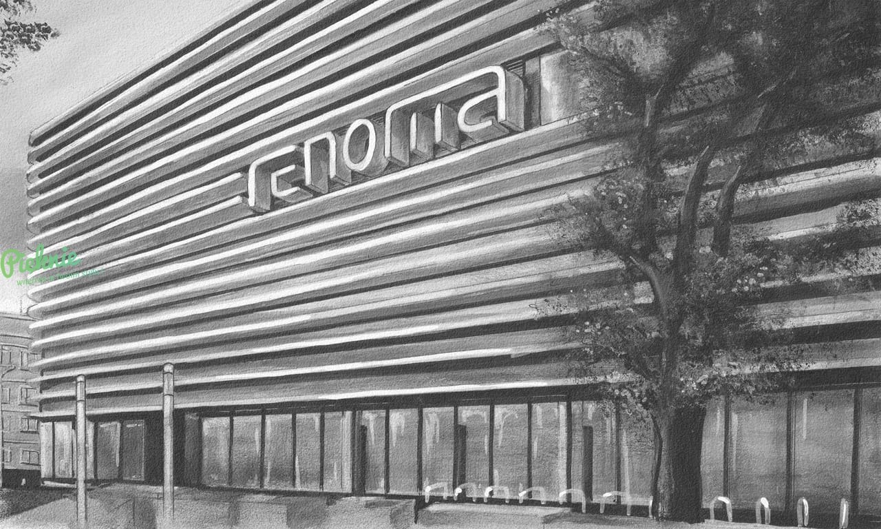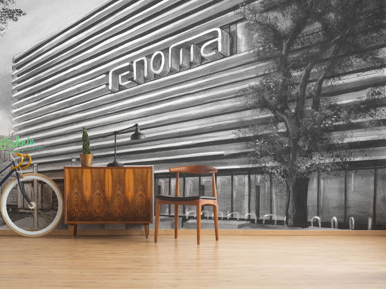 Fototapeta z motywem fasady Centrum Handlowego Renoma we Wrocławiu, utrzymana w odcieniach w czerni i bieli. Podaj nam wymiary, a my przygotujemy indywidualną wycenę i kadrowanie: info@pieknie.pl