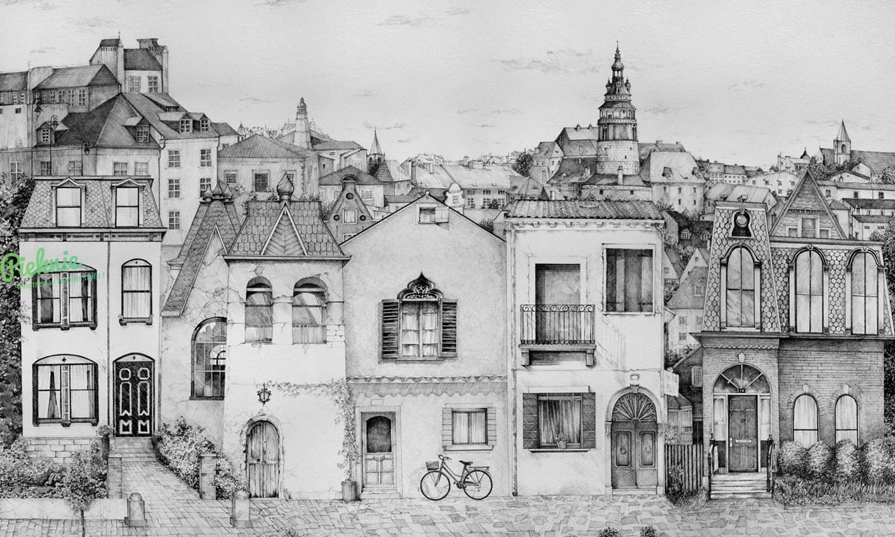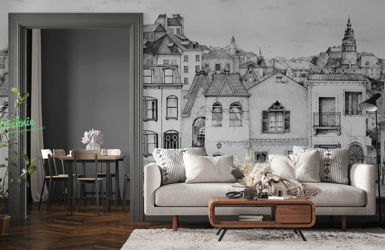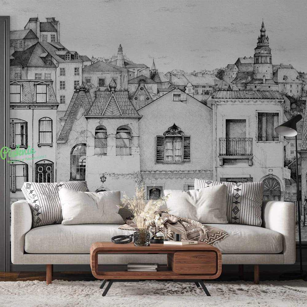 Fototapeta z motywem starych kamieniczek w czerni i bieli. Podaj nam wymiary, a my przygotujemy indywidualną wycenę i kadrowanie: info@pieknie.pl