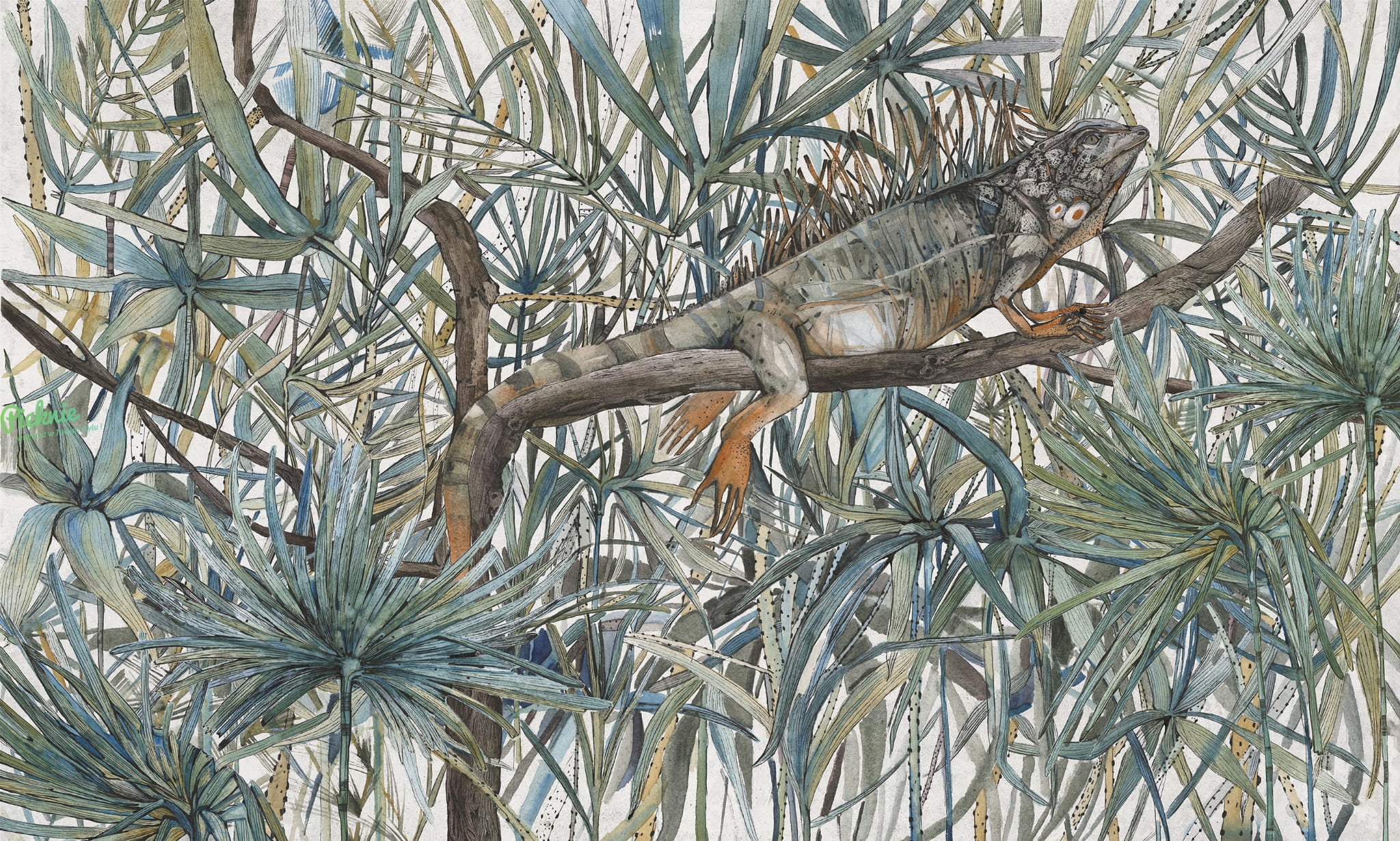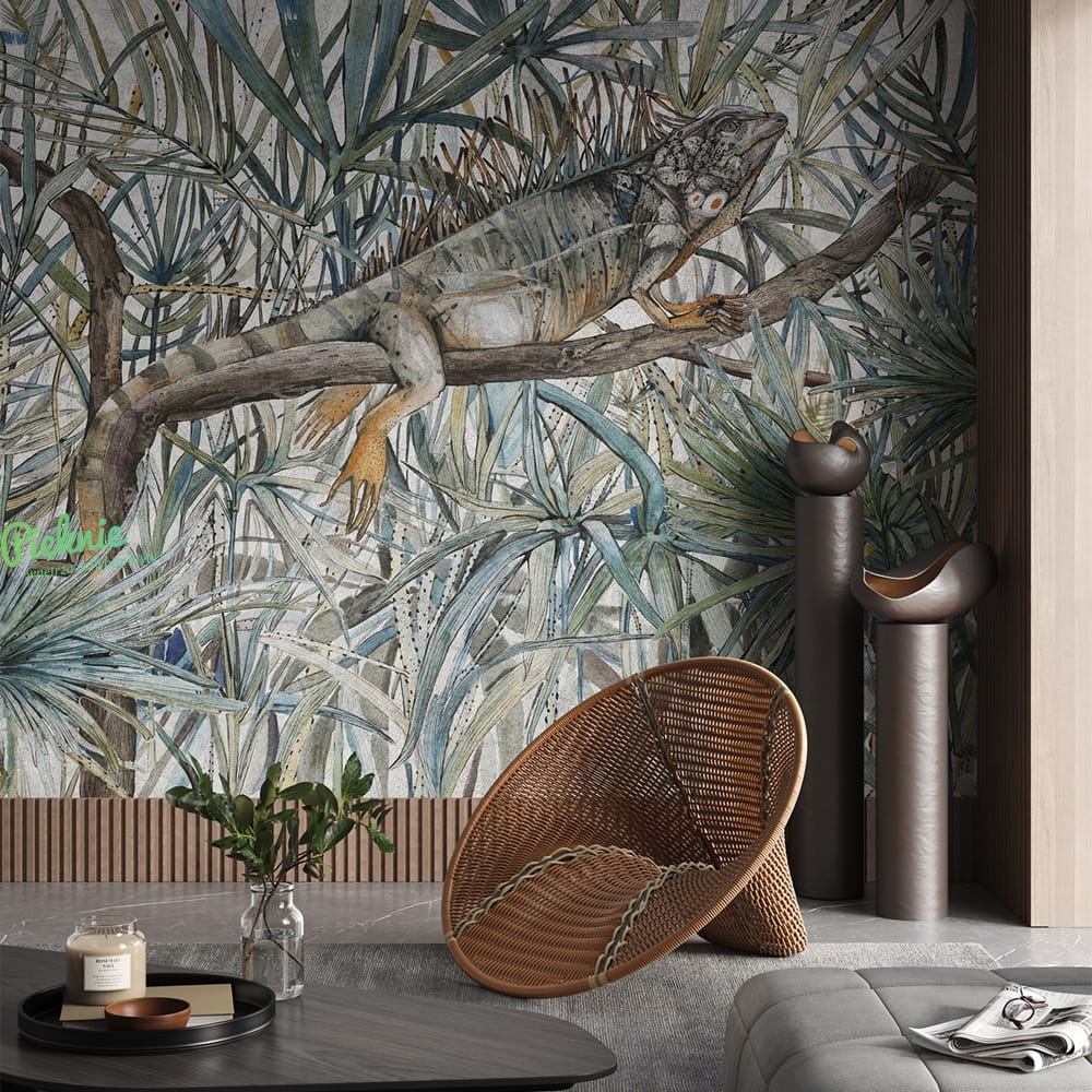 Fototapeta Wonderwall Komodo motywem tropikalnej roślinności i jaszczurki.