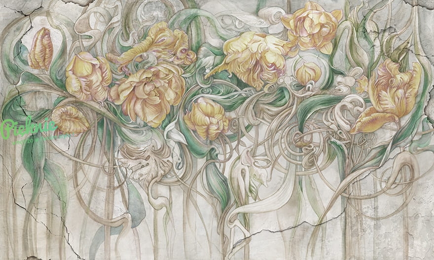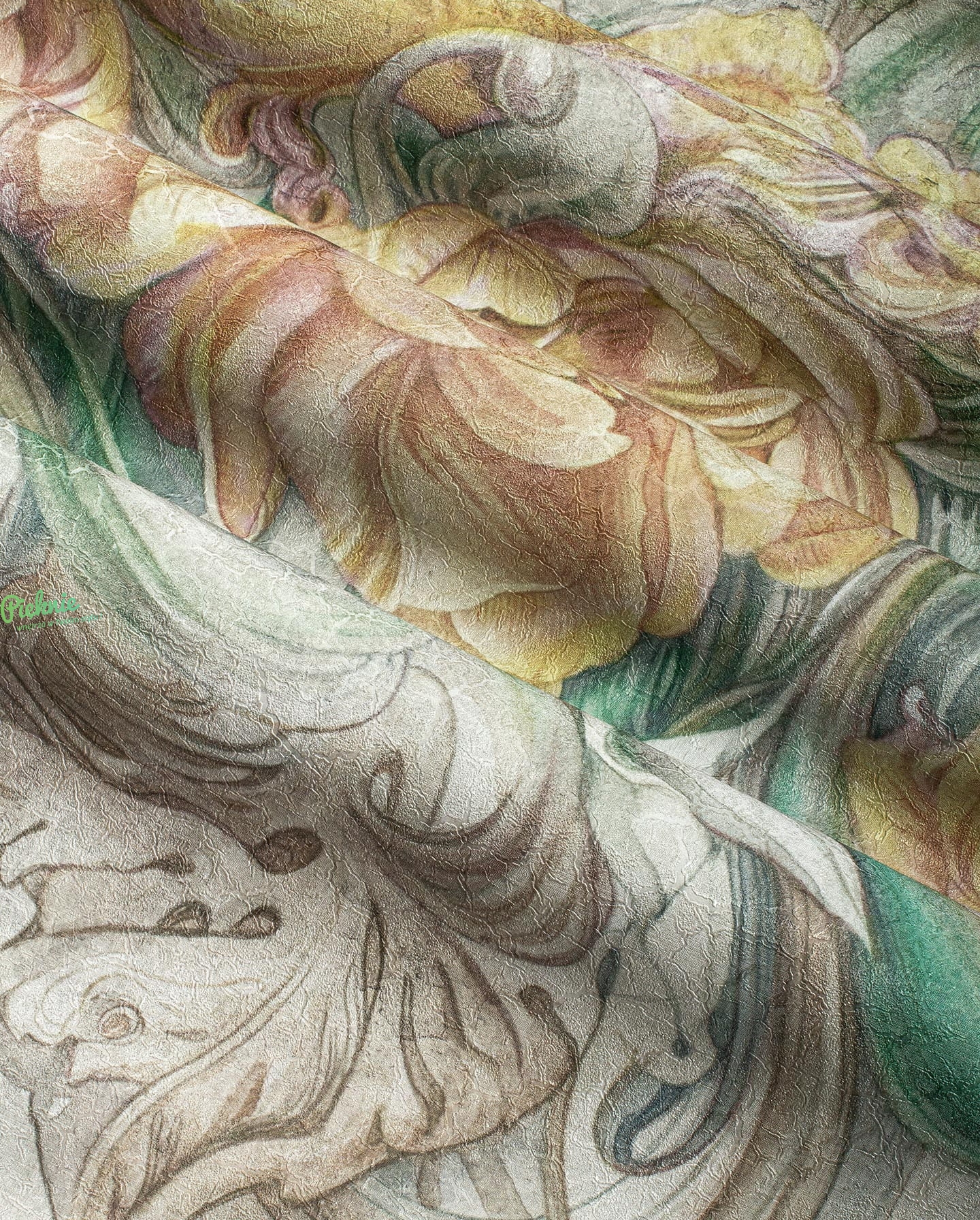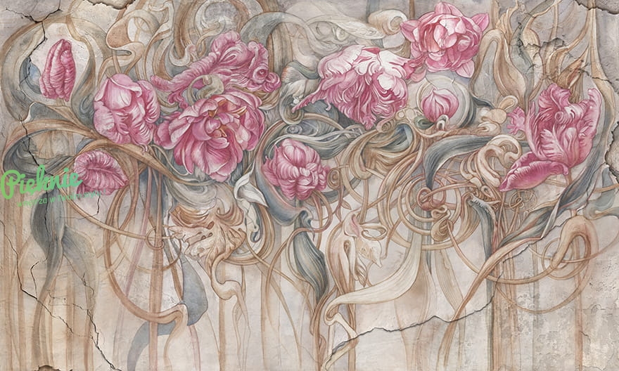 Tapeta Rocalle to unikalna gra kształtów i kolorów ukazująca piękno kwiatów w artystycznym wydaniu. Ten wzór będzie tworzył na ścianie niezapomniany obraz pełen malarskiego rozmachu.