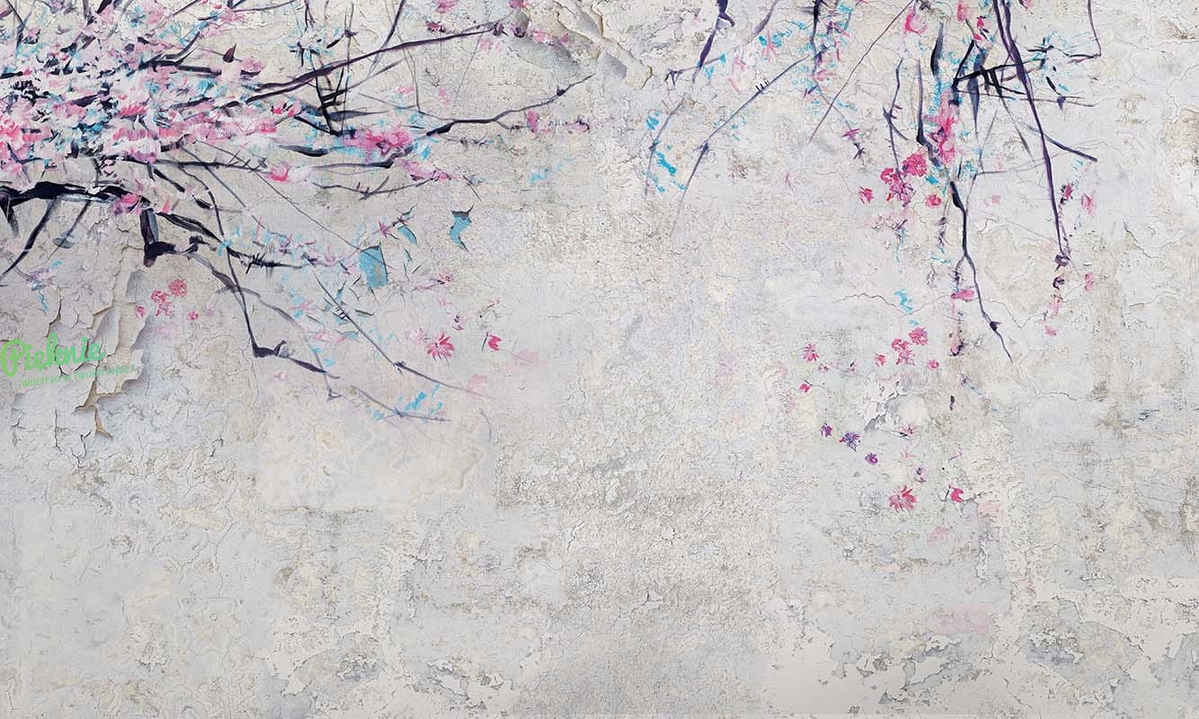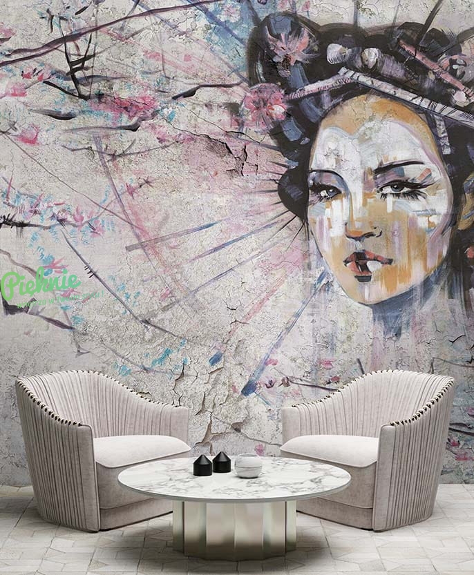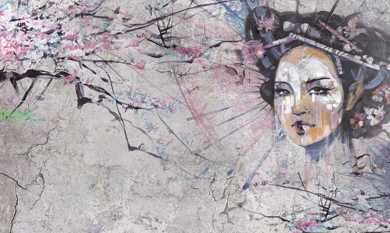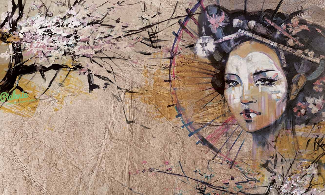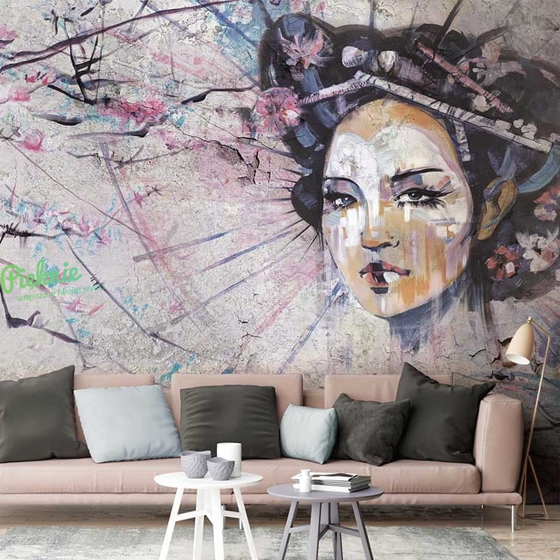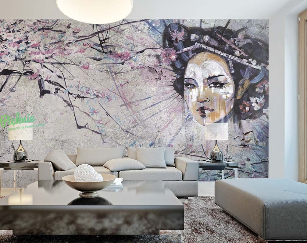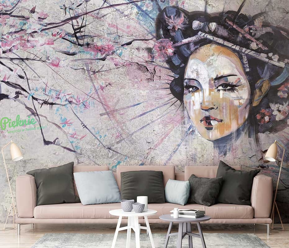 Orientalna tapeta fizelinowa z motywem Gejszy i wiśniowych gałęzi.