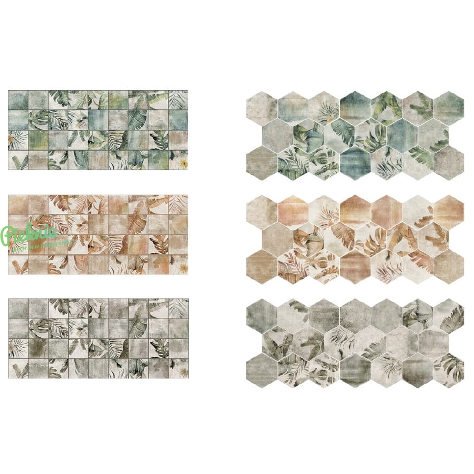 Dekoracyjne kafelki z motywem tropikalnych liści. Kolekcja składa się z 36 różnych wzorów (pakowanych losowo). Wzór z nadrukiem liści posiada około 30-40% płytek w każdej paczce.