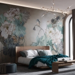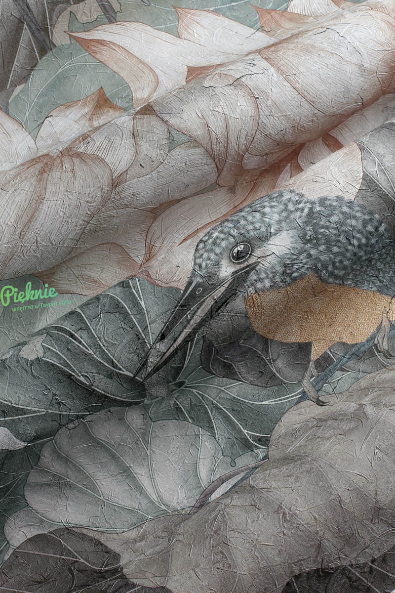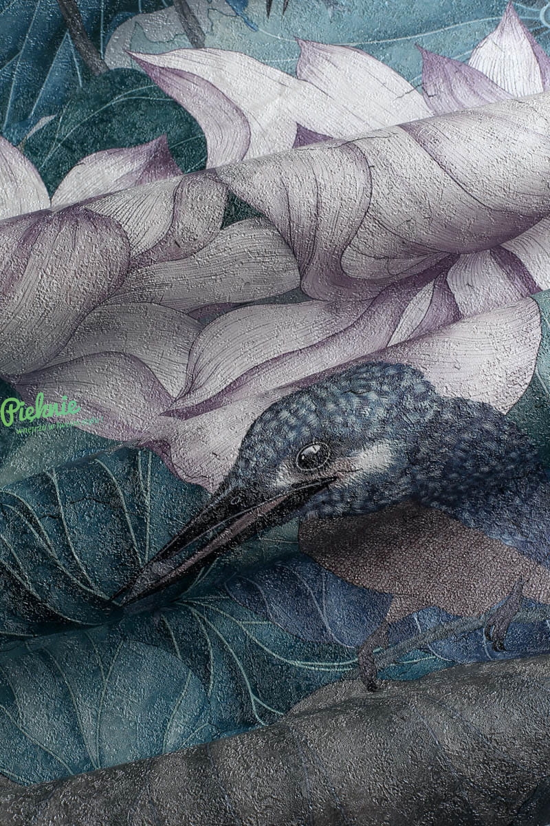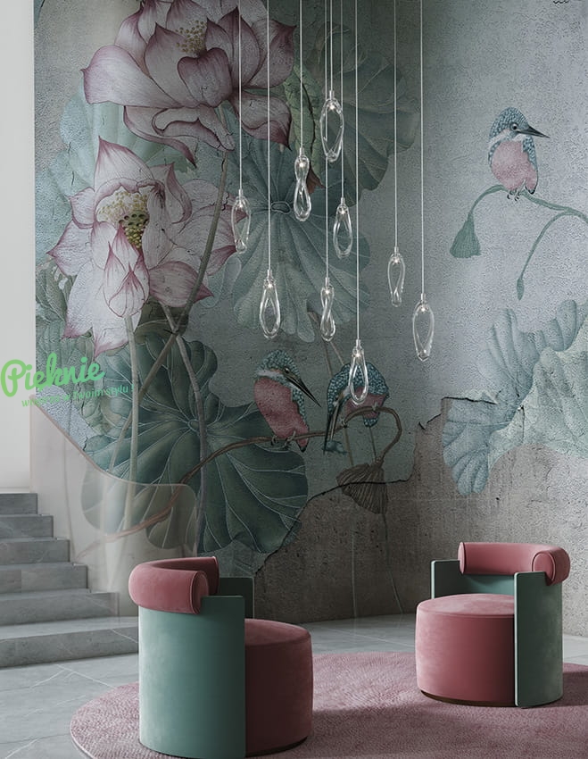 Tapeta z motywem wodnych kwiatów i ptaków.